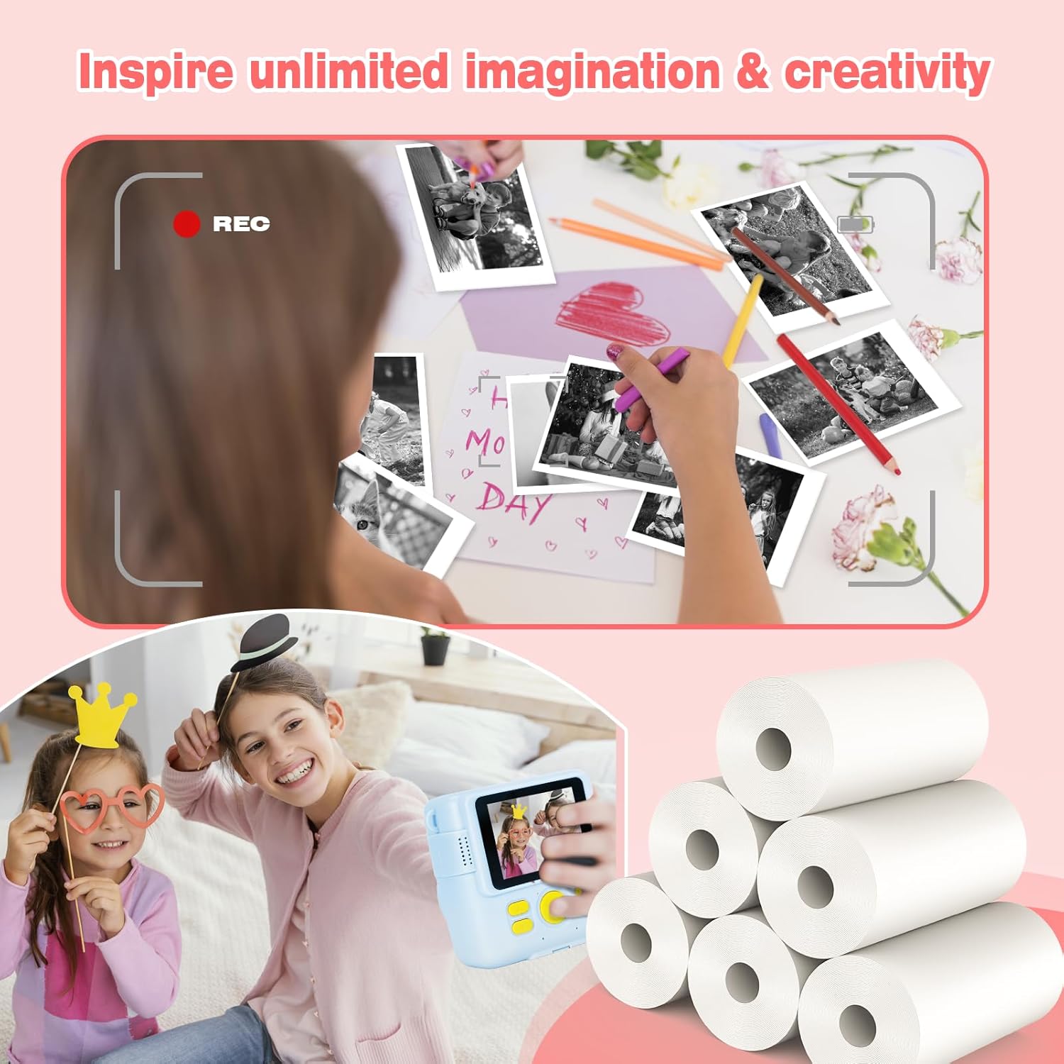 【12 rolls of printing paper】 12 Rolls of Refill Print Paper included. Each roll is about 2.2in × 19.6ft and can print over 80 photos. Kids can enjoy taking pictures without having to stop frequently to refill the paper because of insufficient paper.