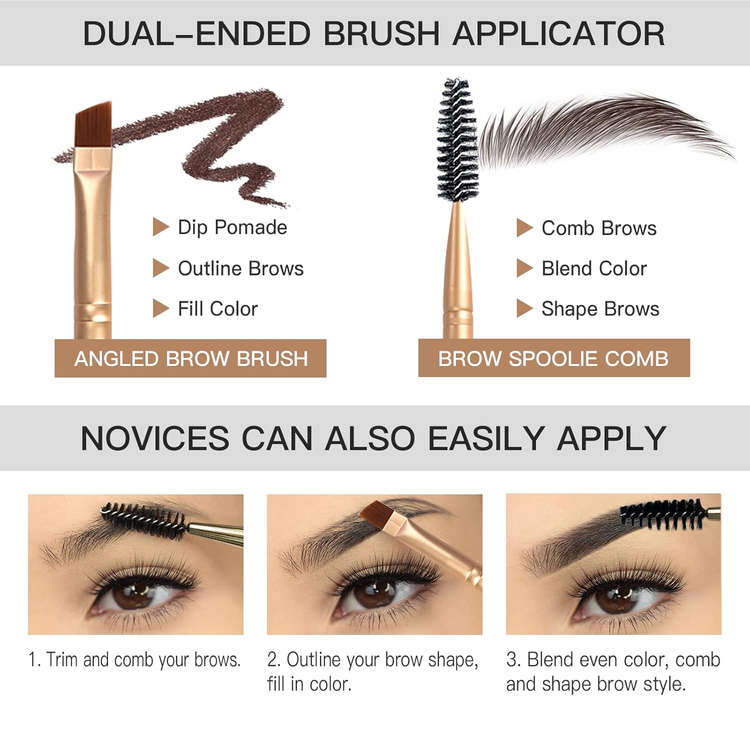 【Dual-ended Eyebrow Brush】Eyebrow Pomade Kit includes a high-quality dual-ended eyebrow brush. It features two different brush heads – one end has an angled brush that allows you to precisely fill in your brows, while the other end has a spoolie brush that blends the product well. It only takes a few seconds to create dimensional and natural eyebrows, perfect for beginners and ladies who are not good at makeup.