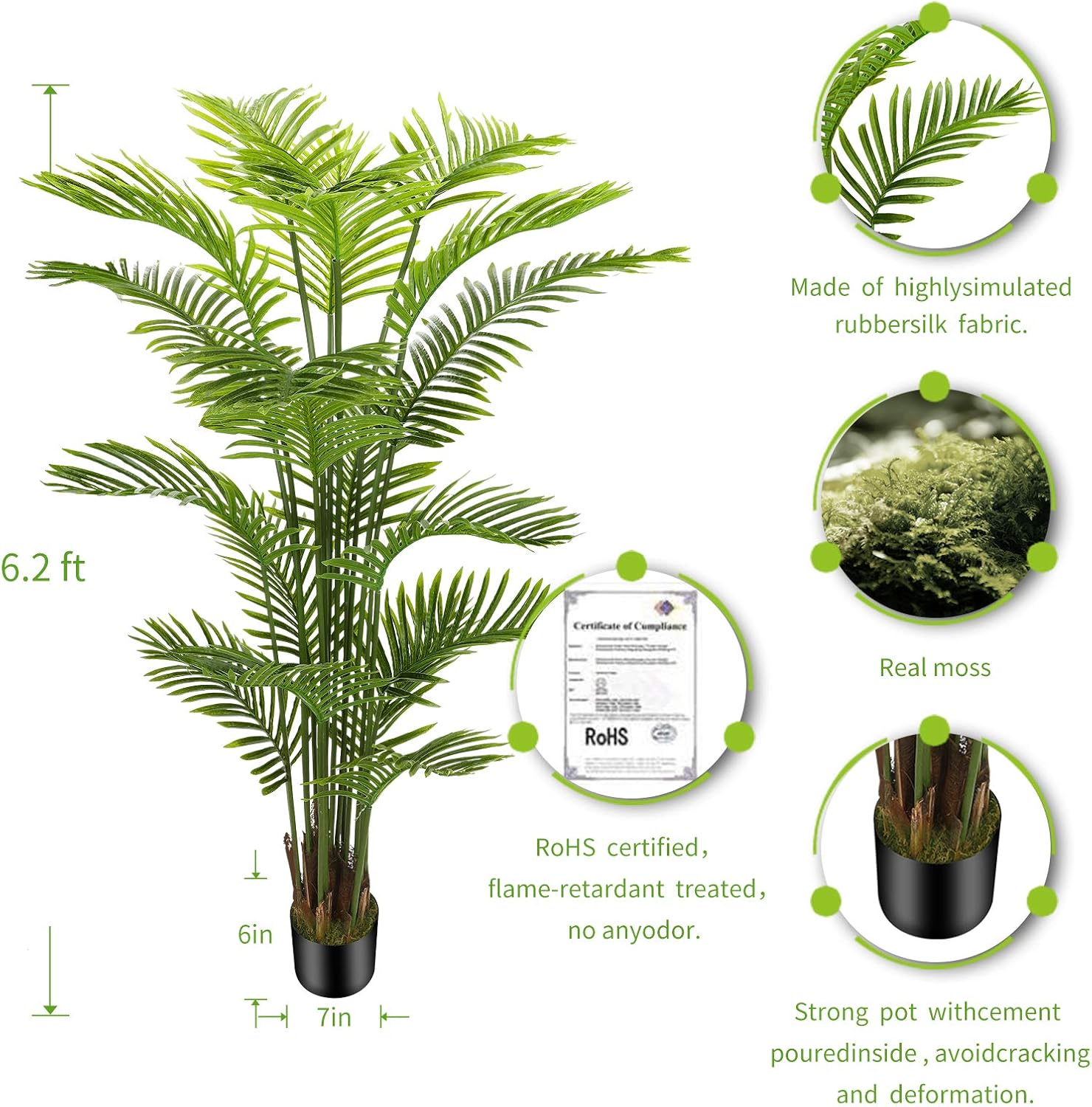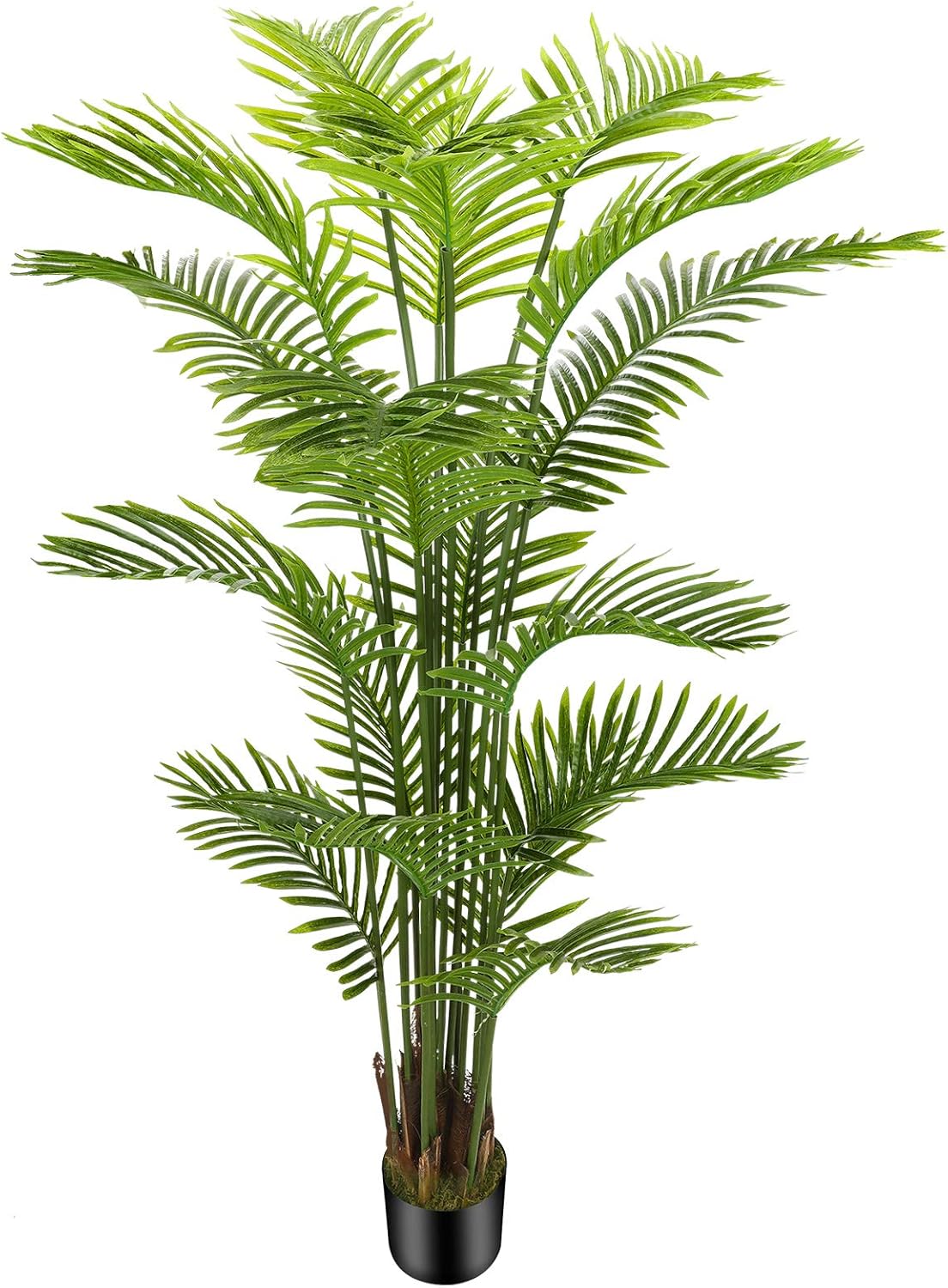 【HIGHLY REALISITC DESIGN】 This artificial tree is made of durable and premium polyester material, contains simulation textured areca palm silk leaves which made rubber silk fabric, the pot is covered with a layer of real moss, these designs make it to be life-like in appearance, the pot is made of solid cement which to prevent children, pets knock it down.