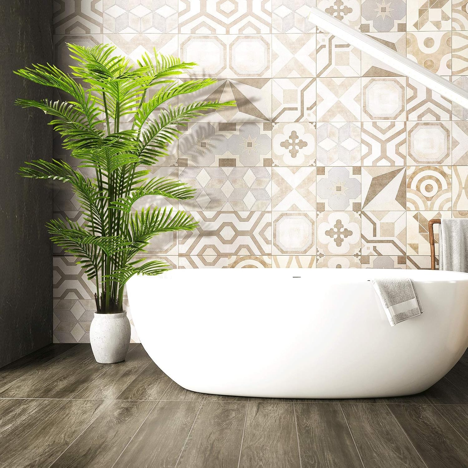 【STURDY AND ADJUSTABLE】 Our artificial kentia areca palm silk tree outfitted with inner metal wires, you can adjust the leaves to the shape you like. This artificial plant will maintain its height, color and shape for years without pruning and shaping to ensure the aesthetic is maintained.