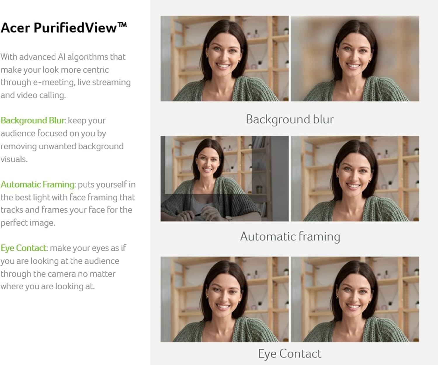 Enhance Your Webcam Experience: The 1080p FHD webcam featuring Acer PurifiedView and Acer PurifiedVoice 2.0 with AI noise reduction and triple microphone array making collaboration a breeze. These technologies work together to boost the video call experience reducing background noise, blurring your background, staying in focus, and more – so you always look and sound your best.