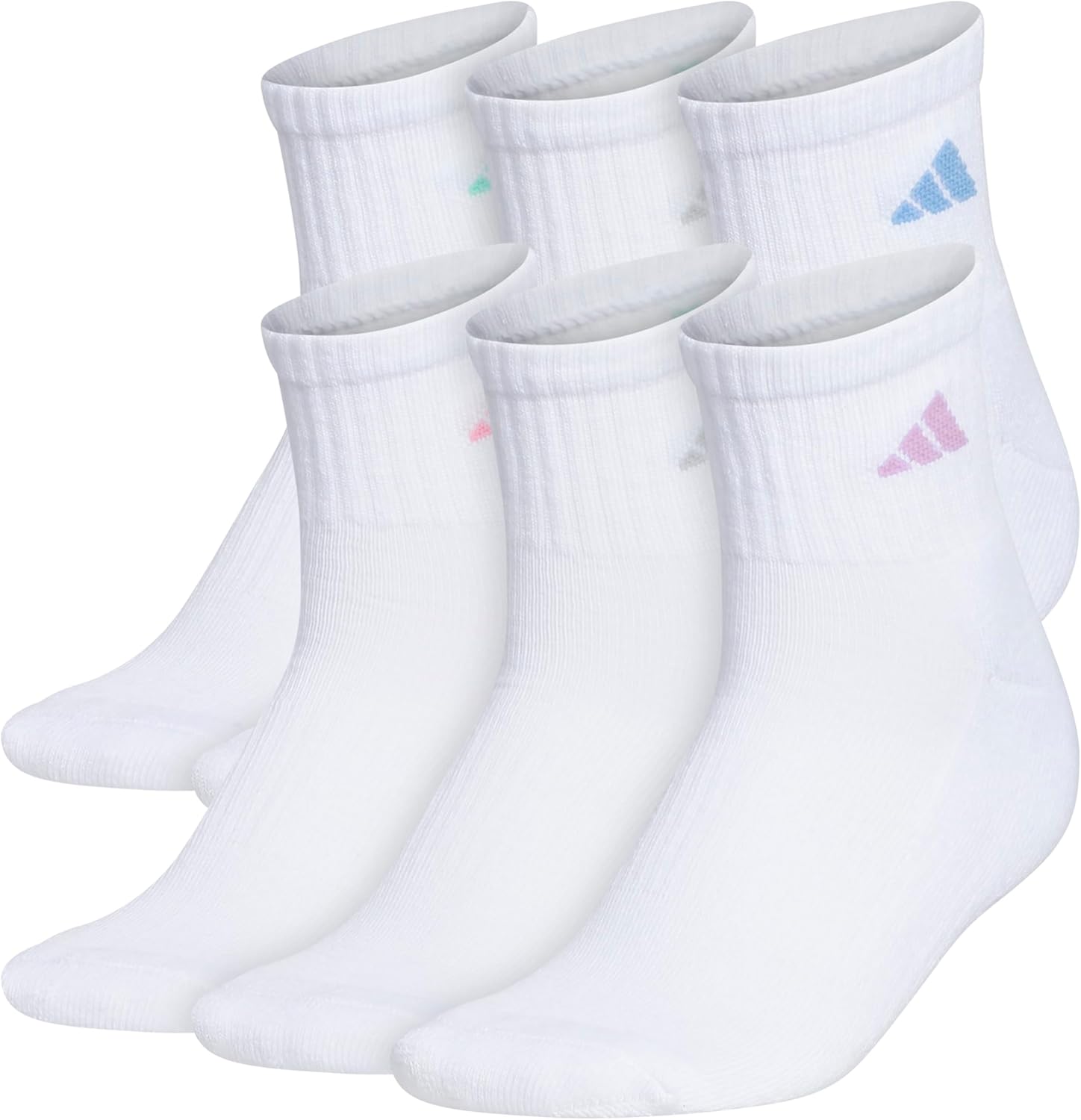 adidas Women’s Ankle Socks, Athletic Cushioned Quarter Fit, 6-Pack, Durable, Comfortable, Cooling, with Compression, White/Clear Sky Blue/Bliss Lilac Purple, M