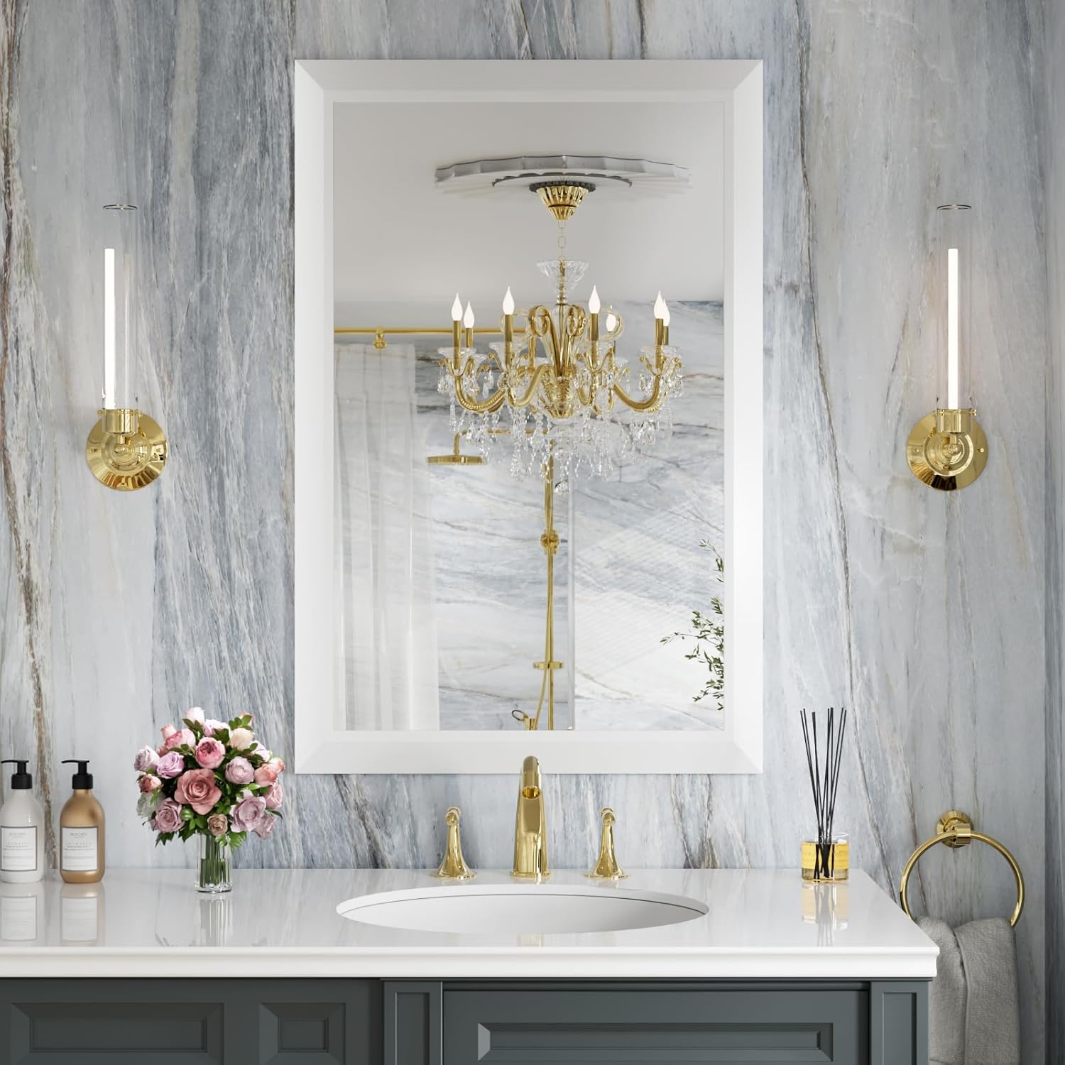 [Special Metal Frame]: Our bathroom mirrors have a special beveled shape of the border for added elegance; Its brushed matte aluminum is sturdy and rust-resistant for a long life; The width of the frame is 2 inches and the thickness is 0.5 inches.
