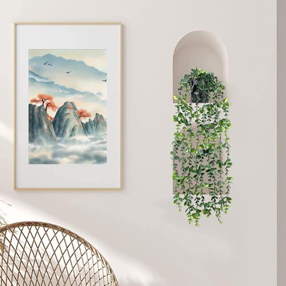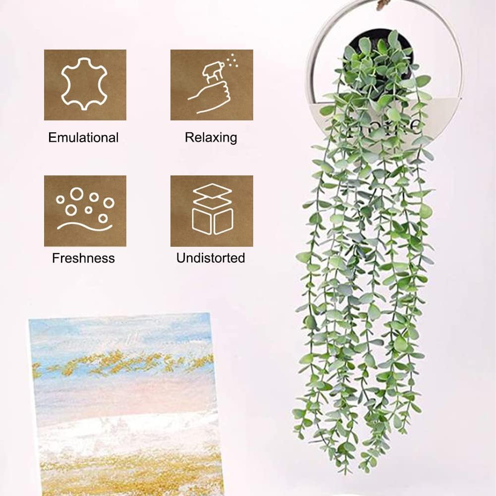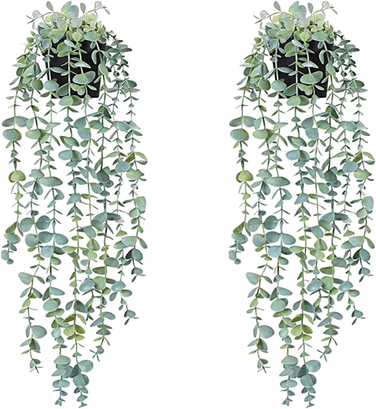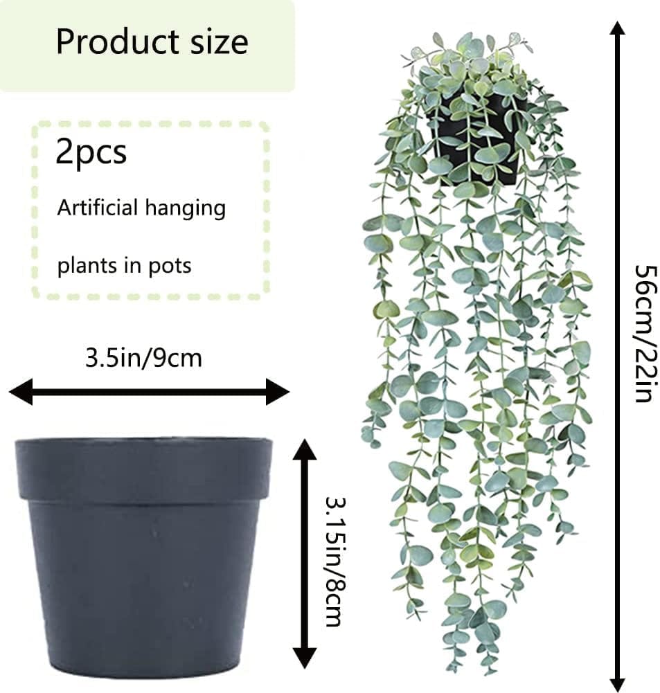 Hanging Plants with Pots: The package includes 2 packs of green Fake hanging plants pot, Each one comes with 1 black flower pot. Artificial plants each with 9 bifurcations, the length of different branches is different, and the total length of the artificial eucalyptus plant is 56cm/22inch.