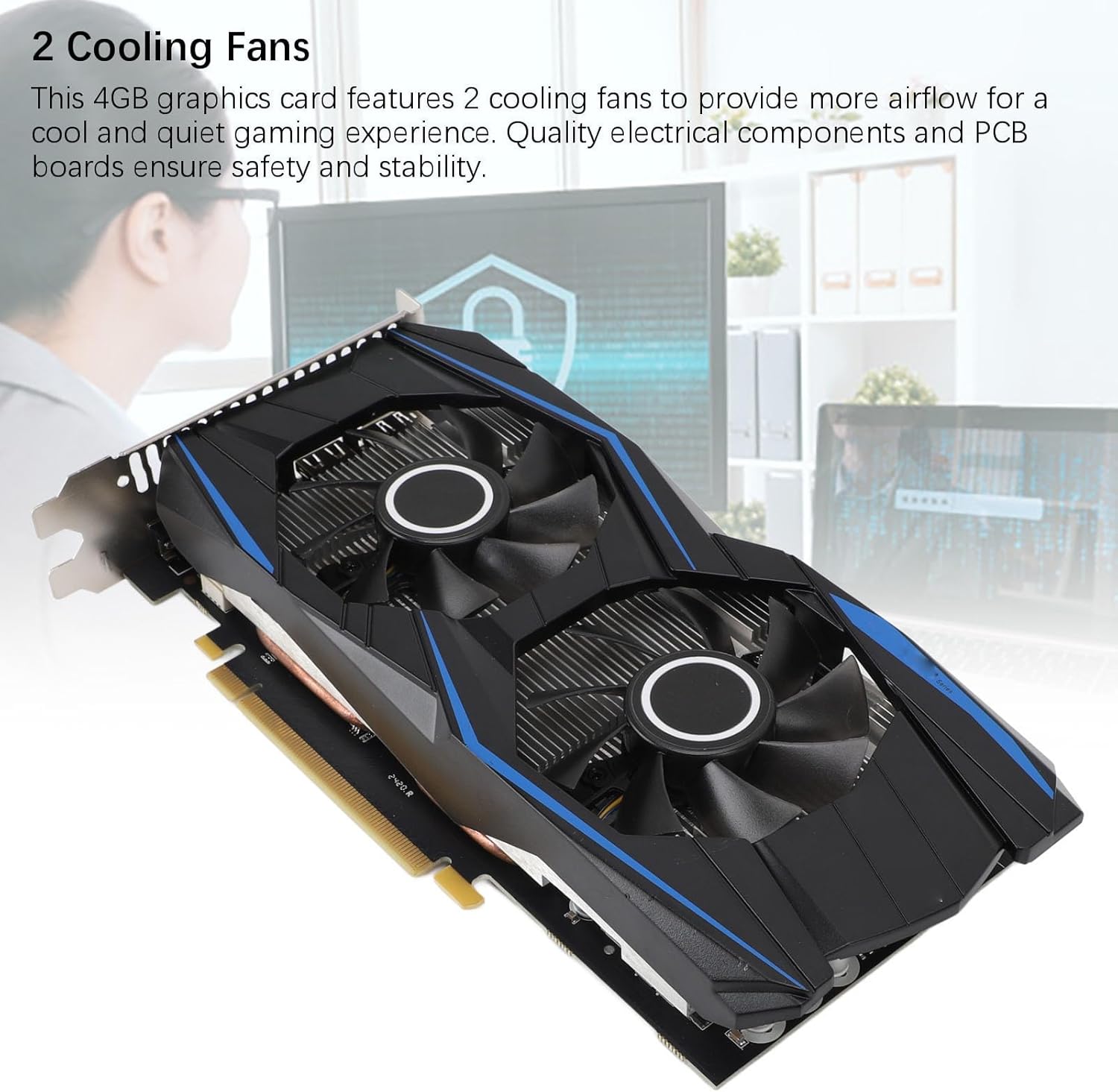 2 Cooling Fans: This 4GB graphics card features 2 cooling fans to provide more airflow for a cool and quiet gaming experience. Quality electrical components and PCB boards ensure safety and stability.