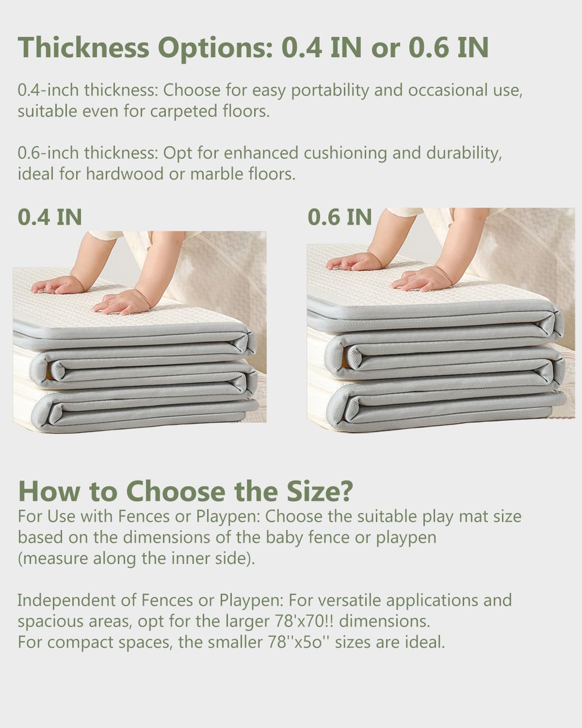 [Multi-specification & Large Size]: Our baby mat for floor desighed in multiple sizes. The 50″*78″ & 70″*78″ provide enough space for your little one to explore, play, and take a nap. We are the only brand that provides with 0.4″ and 0.6″ thickness playmats on Amazon, more specifications for you to choose.