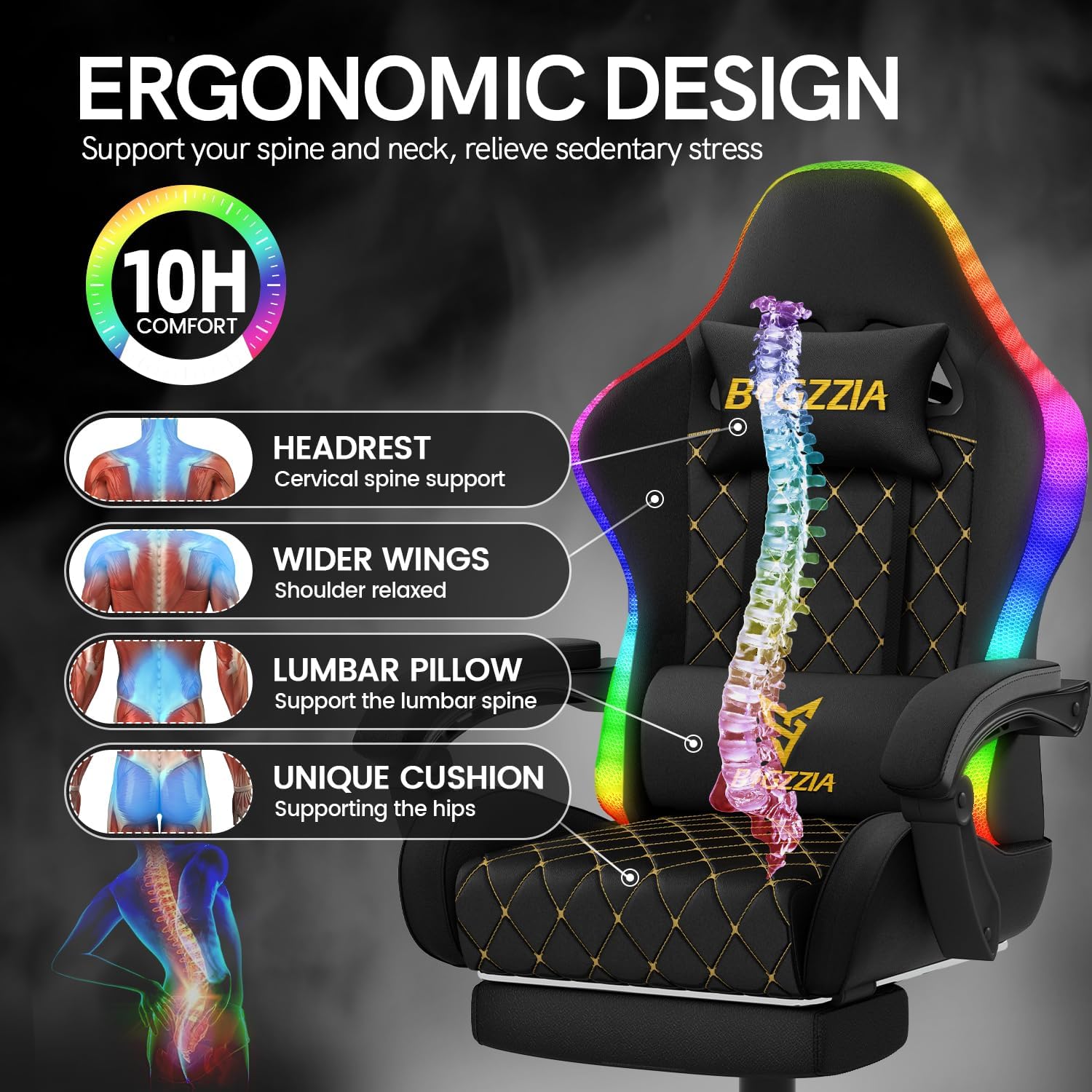 Ergonomic Design: Ergonomic gaming chair features an adjustable headrest, lumbar pillow, 90°-135° reclining backrest, and retractable footrest, providing full-body support to ensure optimal comfort whether you’re working or relaxing.