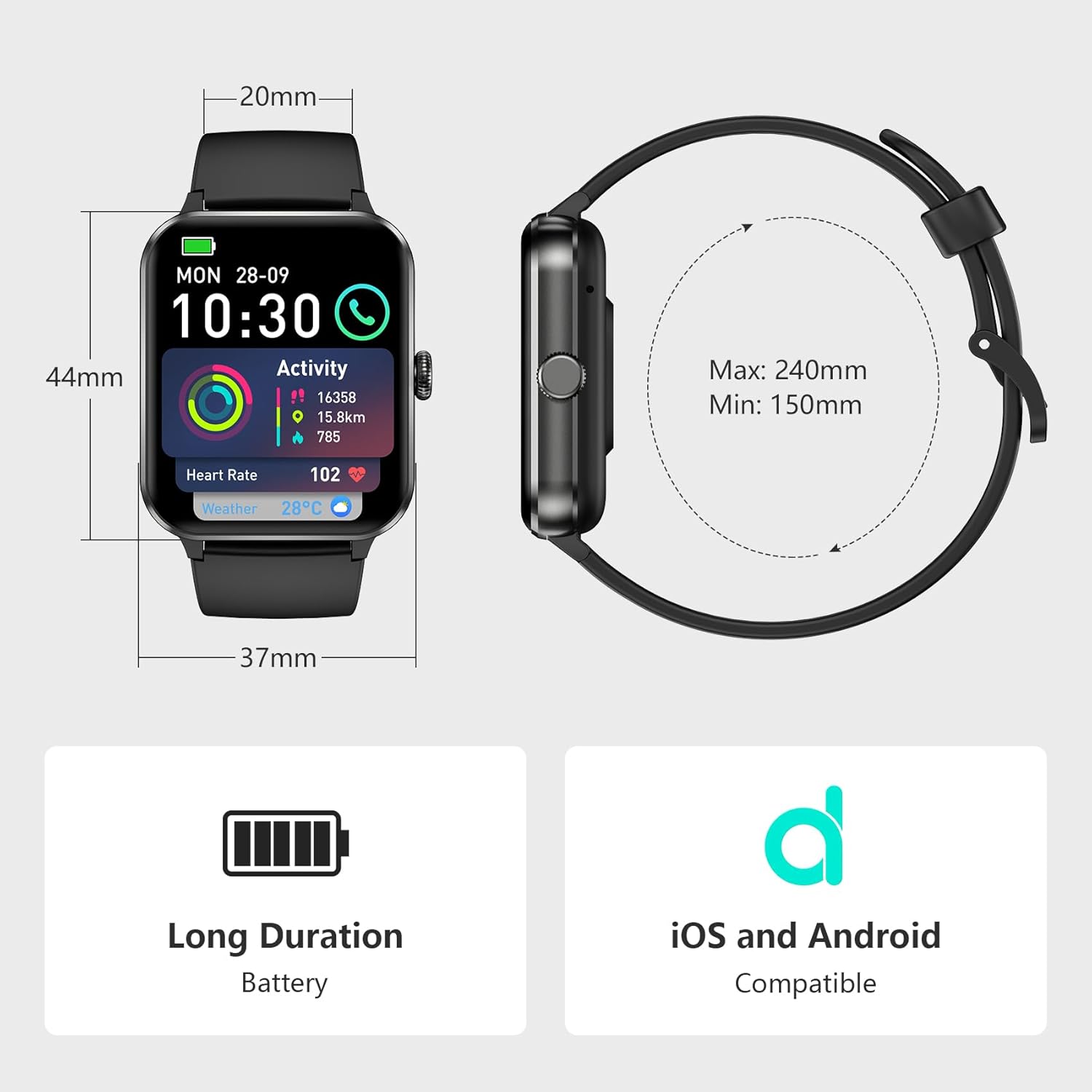 👍【More Smart Tools】Apart from the features mentioned above, this smartwatch also offers other useful daily functions such as smart notifications, music control, camera control, casual games, weather forecast, sedentary reminders, alarm clock, stopwatch, timer, etc. Compatible with most Android 6.0 and iOS 9.0 or above smartphones, it comes with a built-in large capacity battery of 350mAh, which ensures up to 7 days of use and approximately 30 days of standby with just 2 hours of charging.