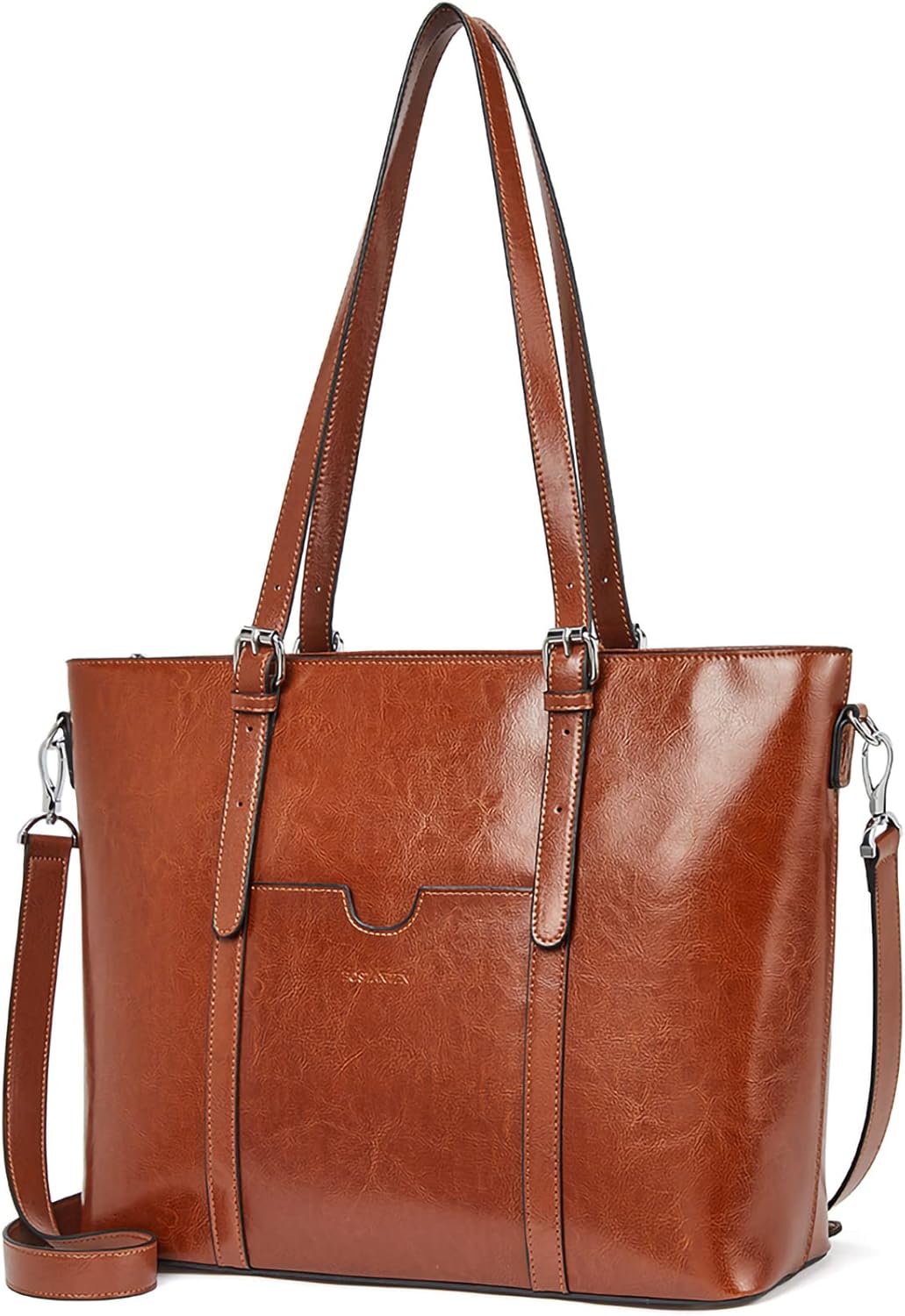 Customers find this handbag classy and well-designed, with high-quality leather that’s soft yet sturdy. The bag is spacious, accommodating laptops and other essentials, and features plenty of pockets both inside and outside. They appreciate its sturdiness, with one customer noting it stands securely on rolling luggage, and find it perfect for both work and travel.