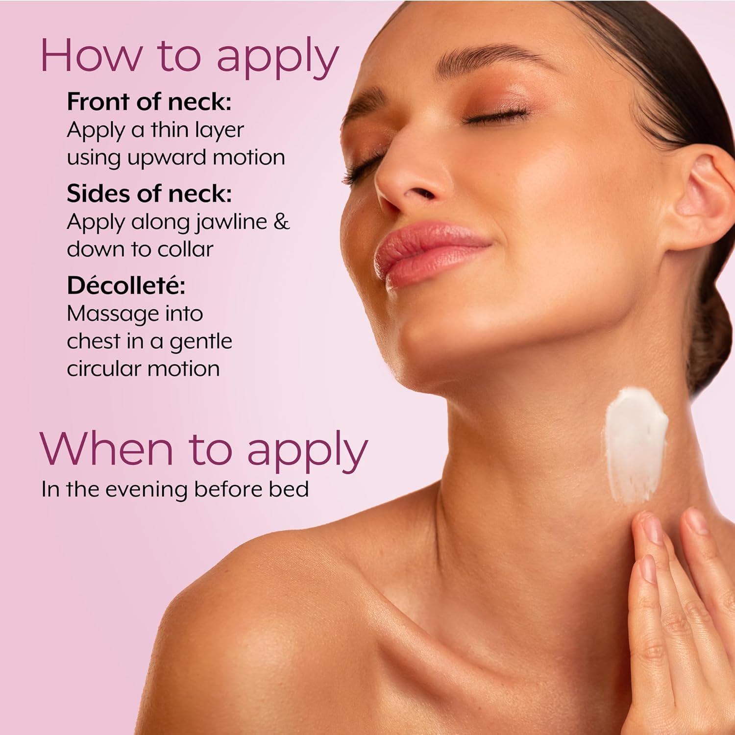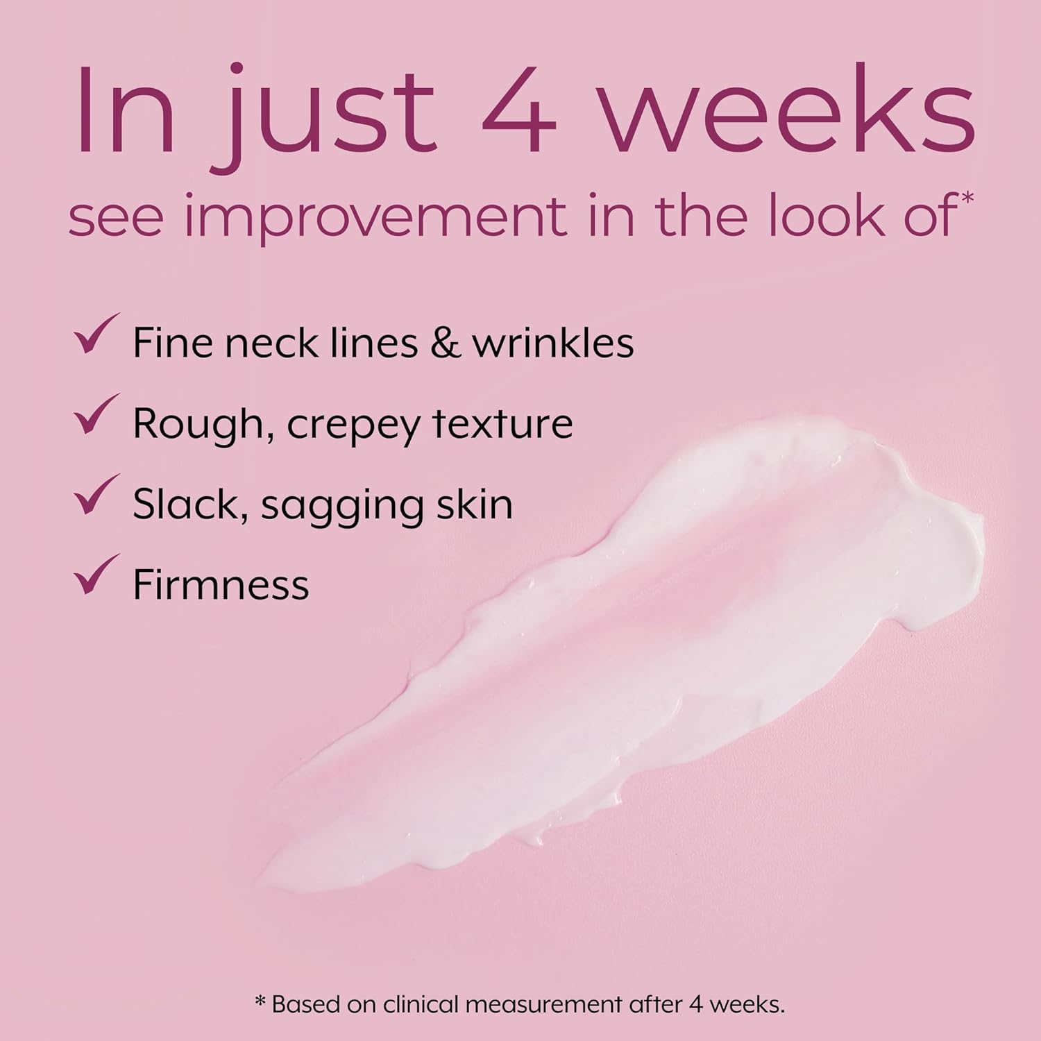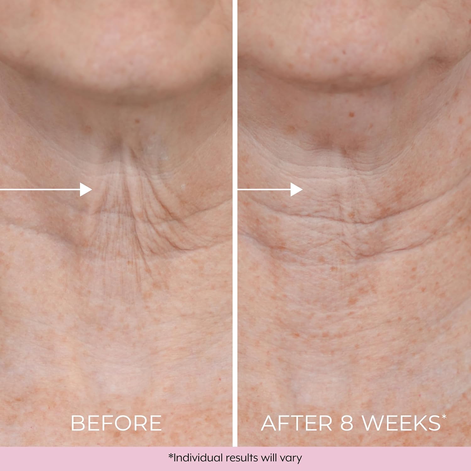 CONSUMER TESTED – 95% of women said the skin on their neck and chest looked firmer after just 4 weeks. After 8 weeks 100% said their neck and chest felt smoother, and 92% said the wrinkles on their neck and chest looked improved.