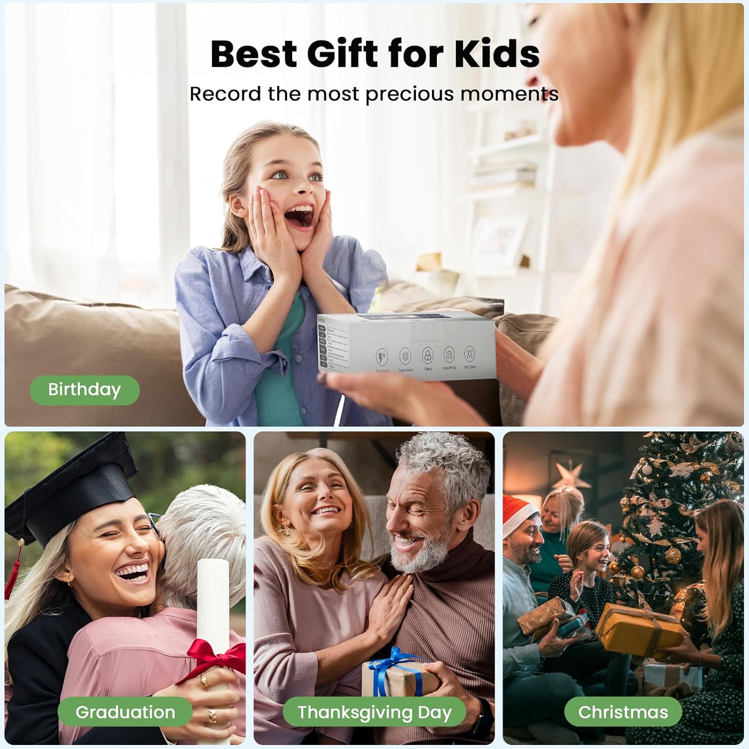 【Powerful Samll Camera Digital 】- Weighing only 0.48lb and boasting a 2.4-inch LCD screen, this compact digital camera is smaller than a smartphone. Despite palm size, the kids camera supports 18X digital zoom, MP3 player, date stamp, timer photo, continuous shooting, fill light, loop recording, slow motion, 10filter effects, webcam functionality, and video pause. Perfect for sparking kids’ creativity and fostering an interest in photography.