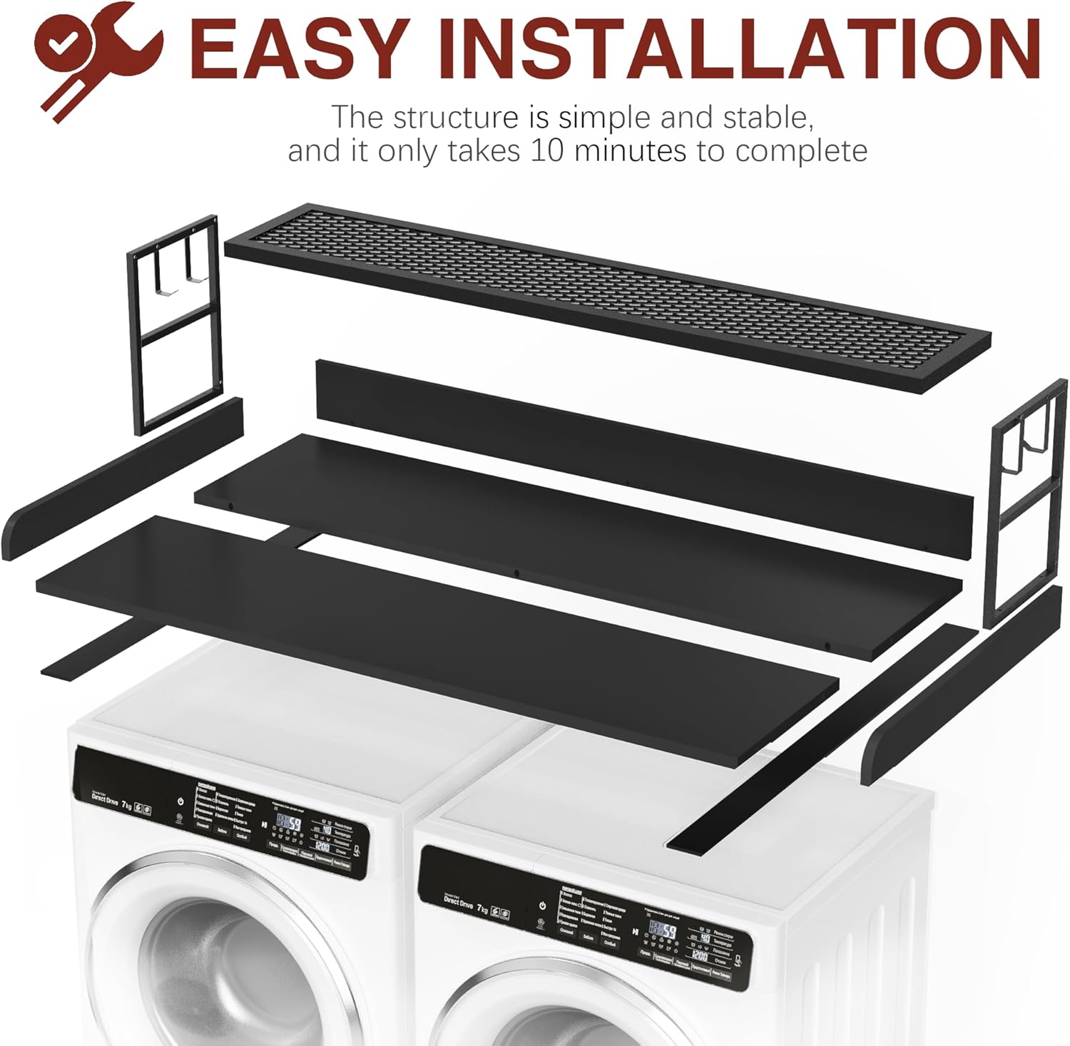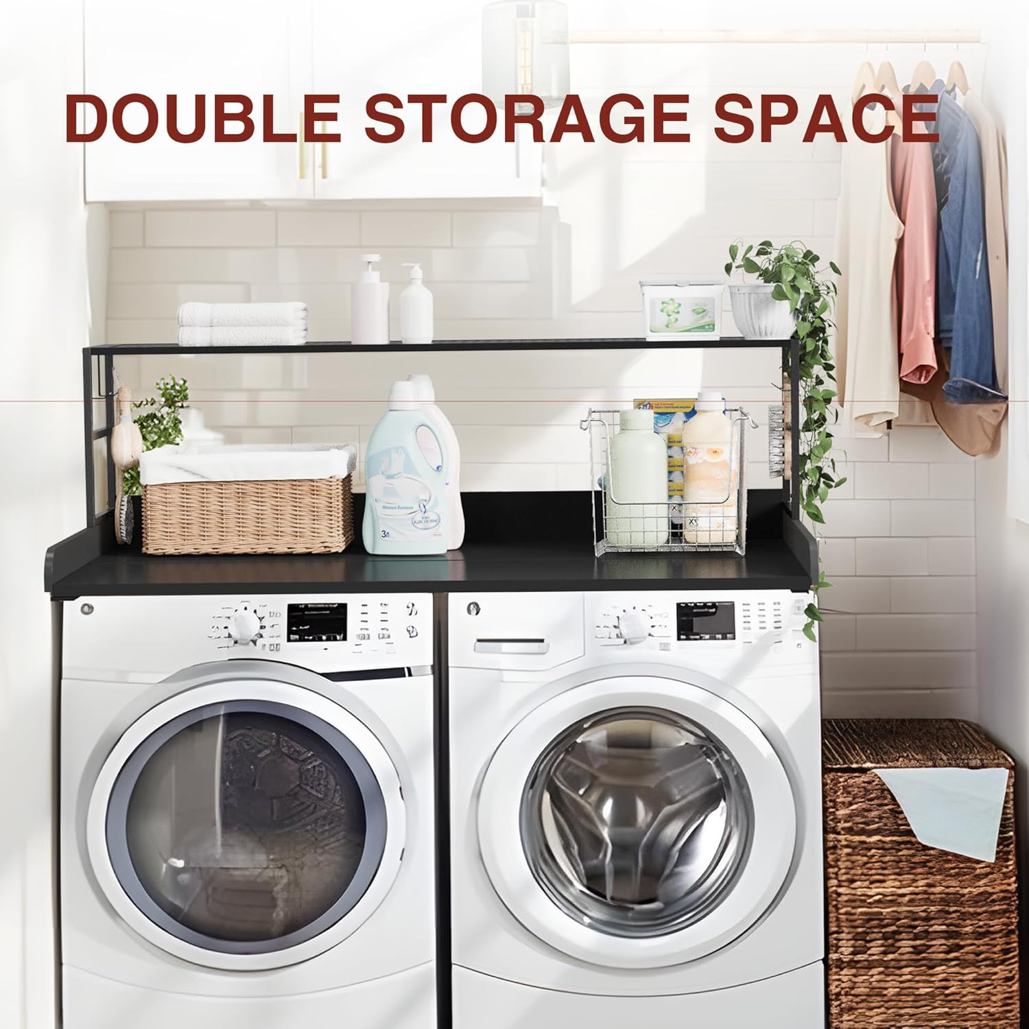 Efficient Storage solution: Our washer dryer countertop comes with addtional shelf for more storage space. Four hooks also provide hanging storage. The multifuntional countertop with shelf could be as a platform and organizer for your washer and dryer top. The countertop could help you to make reasonable use of the ineffective space above the washing machine. Making your life easier, cleaer and more convenient.