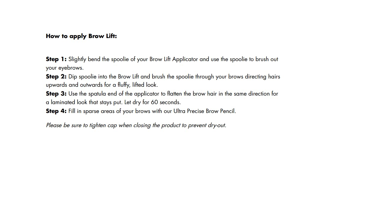 PAIR WITH: Apply Brow Lift with our Brow Lift Applicator for a seamless, mess-free application, long-lasting hold, and lifted, fluffy brows that stay put all day. Spoolie sold separately.
