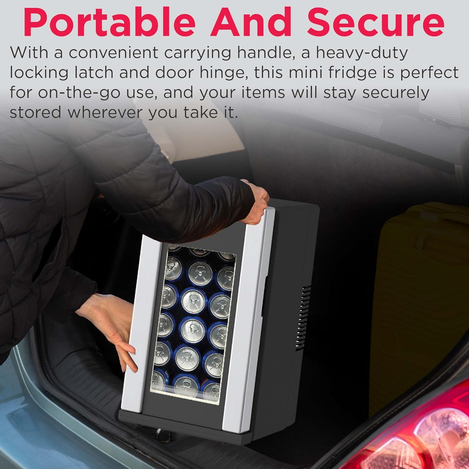 MINI BUT MIGHTY: Large storage capacity. This mini drinks fridge can store 12 Litres. 4 of your favourite bottles with space for 3 Cans or 18 Cans