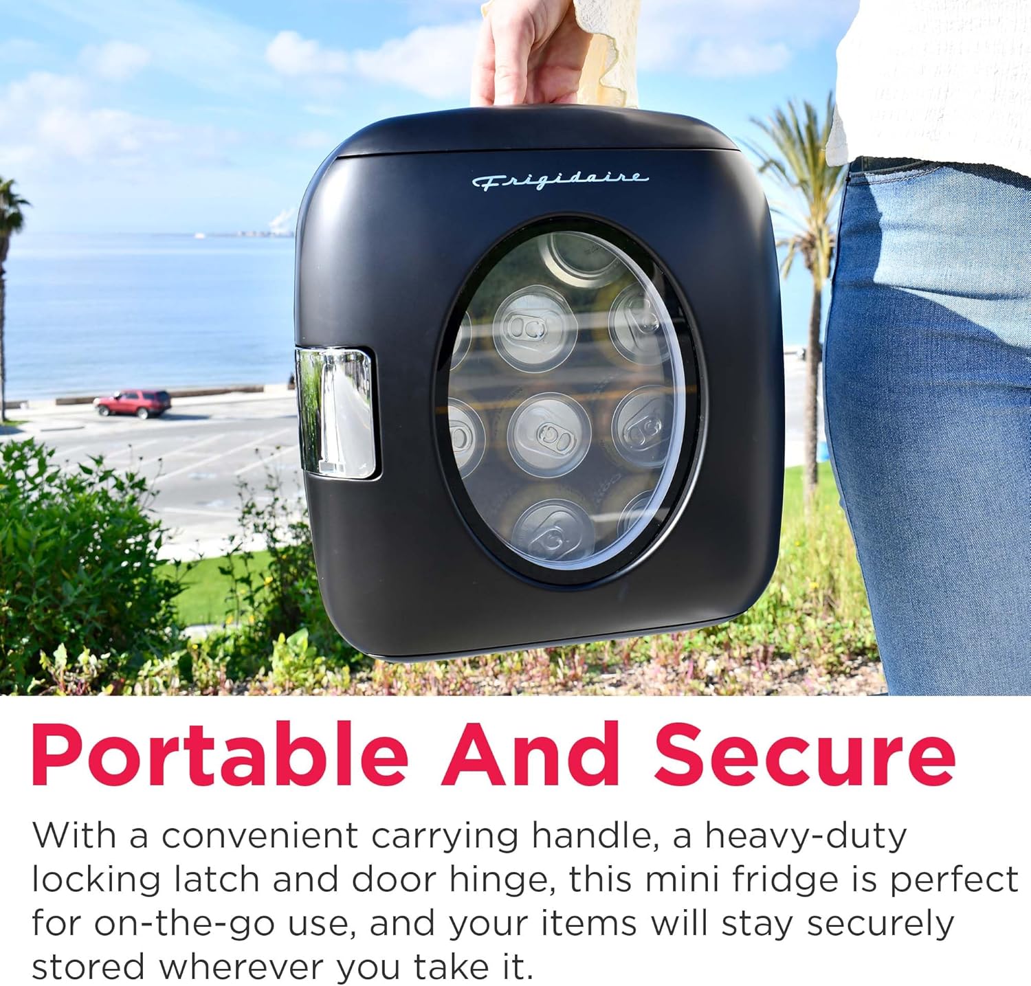 PORTABLE & SECURE: Compact and portable with a convenient carrying handle, this mini fridge cooler is perfect for on-the-go use, weighing only 6lbs. With a heavy-duty locking latch and door hinge, your items will stay securely stored wherever you take it.