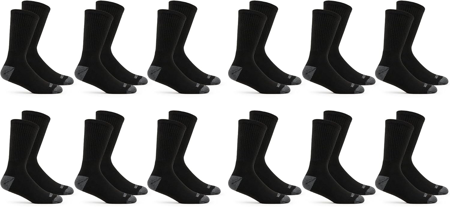 Our men’s crew socks in a 12-Pair value pack feature dual defense technology’s long lasting moisture wicking and odor protection. Cushioned for comfort, these everyday socks also have a reinforced heel and toe for added durability.