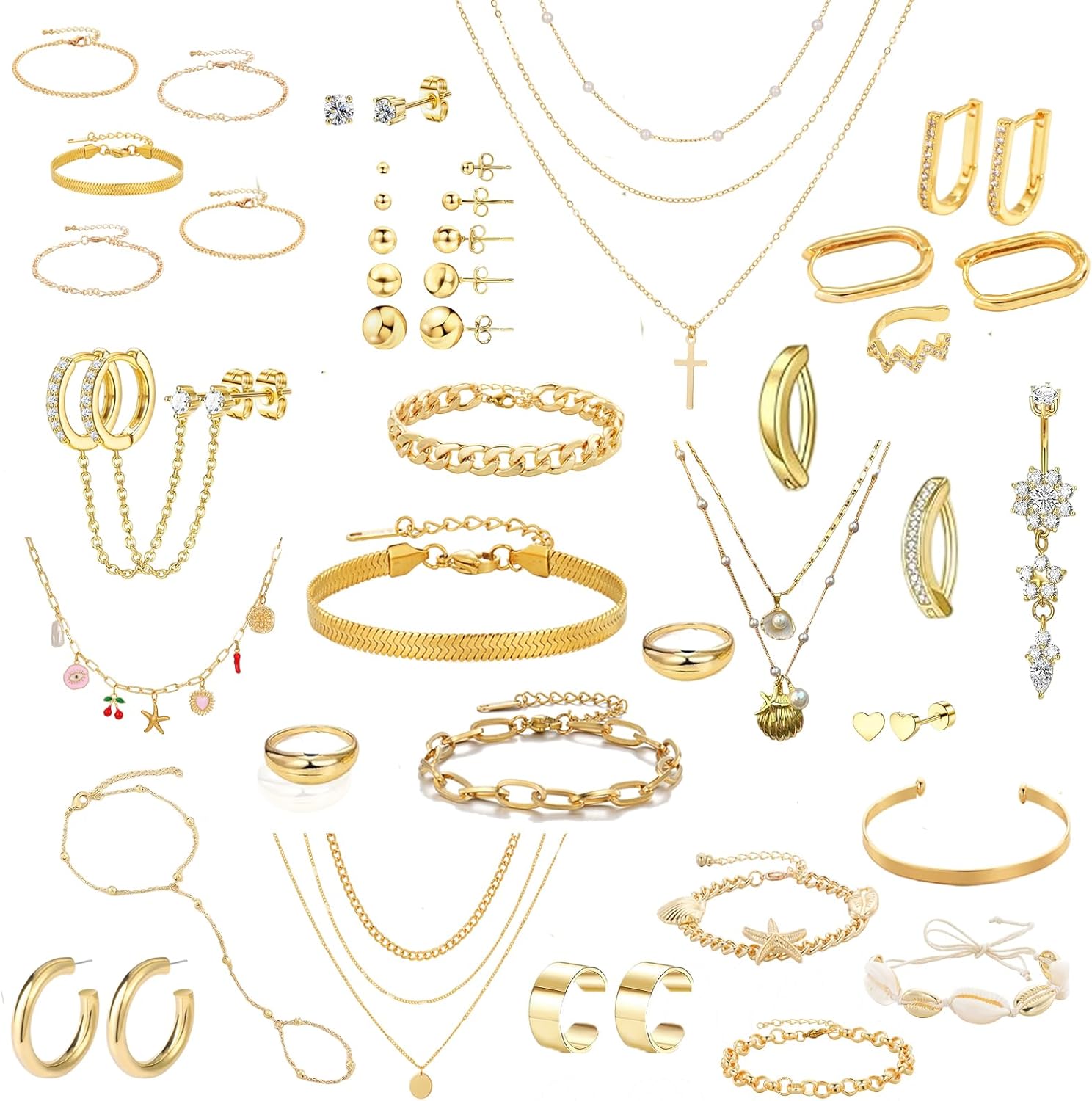 Gold Jewelry Set for Women,53 PC Gold Plated Jewelry Set with 9 Necklace, 9 Bracelet, 25 Ear Cuffs Earring, 5 Ankle Bracelets ,2 Rings and 3 Belly Button rings for Women Valentine Anniversary Birthday Gifts