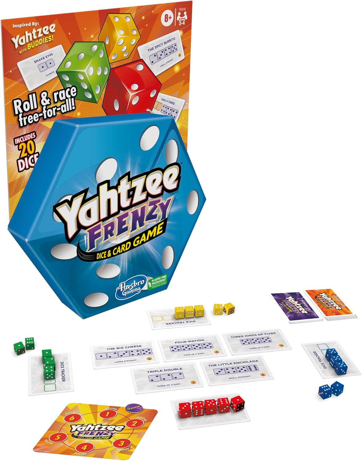 YAHTZEE FRENZY DICE GAME & CARD GAME: At the same time, all players roll and race their dice trying to be the first one to match sets shown on the combo cards. After 6 rounds, the player with the highest score wins