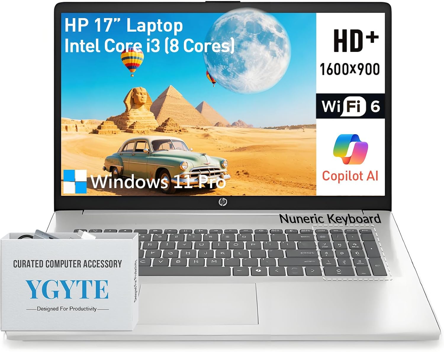 Sleek silver chassis, ergonomic lift-hinge, full-size keyboard with numeric keypad – Built for portability and comfort in a 17.3” hp computer laptop