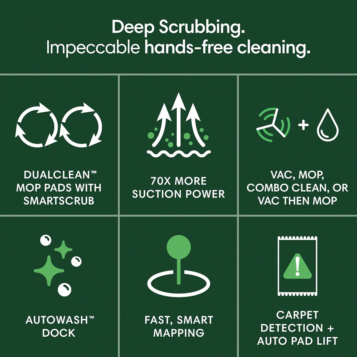 DOUBLES DOWN ON MOPPING. Spinning DualClean Mop Pads and SmartScrub eradicate messes with 2x deeper scrubbing* and downward pressure, Mop with cleaning solution** or water *Compared to standard vacuum & mop mode for coffee and grime