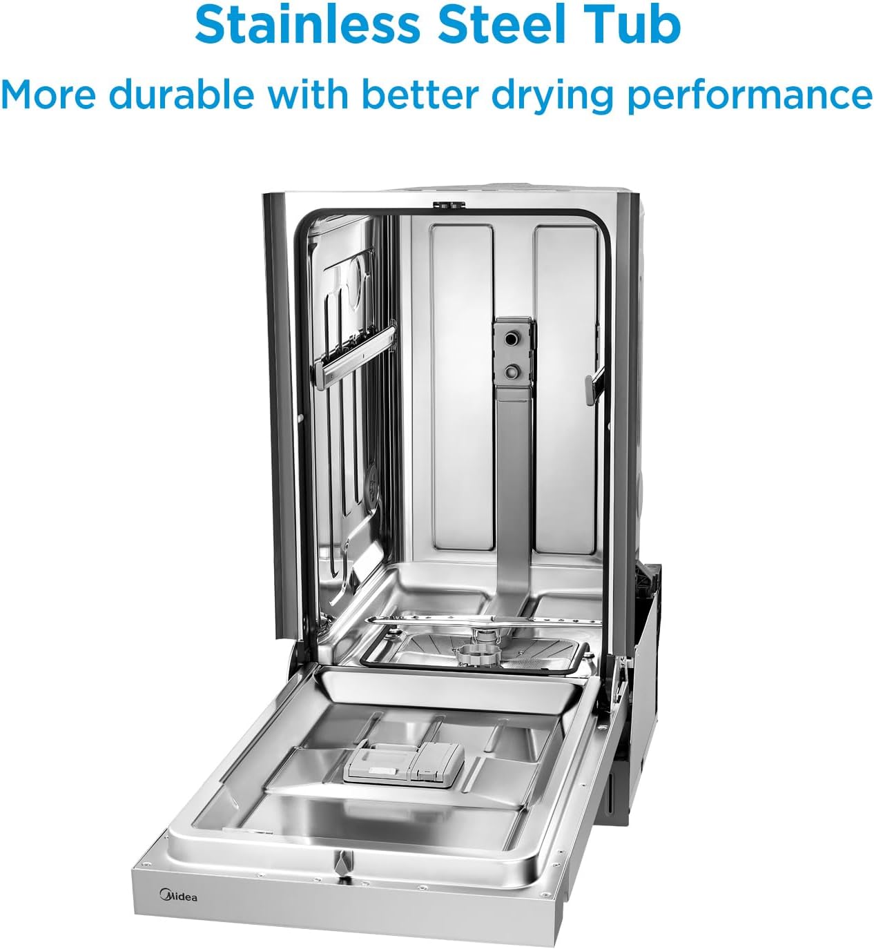 Slimline Design with Large Capacity : The Midea built-in dishwasher boasts a slim body that takes up minimal space and is easy to fit. It features a digital control panel with an LED display and has been thoughtfully designed to accommodate larger plates, pots, and pans up to 11 inches in height.