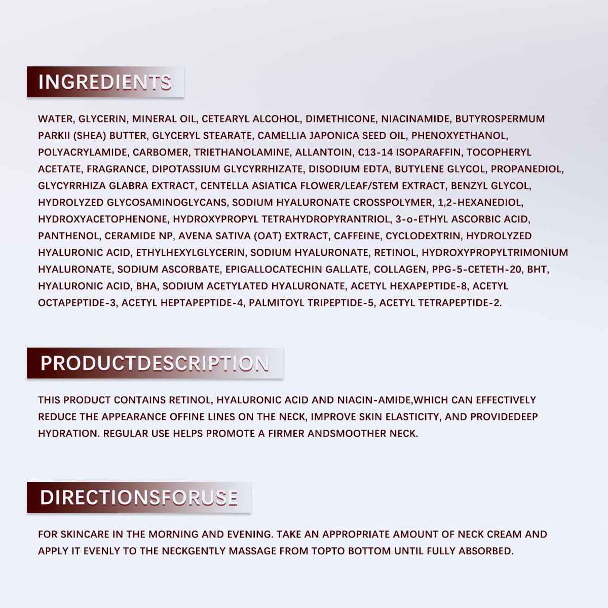 [Firming, Tightening & Anti-Aging]:Retinol stimulates collagen regeneration in the deep layers, peptides smooth wrinkles in the middle layers, and hyaluronic acid enhances moisture and plumpness on the surface. This neck cream works on all three layers of the skin to deliver visible firming and anti-aging benefits