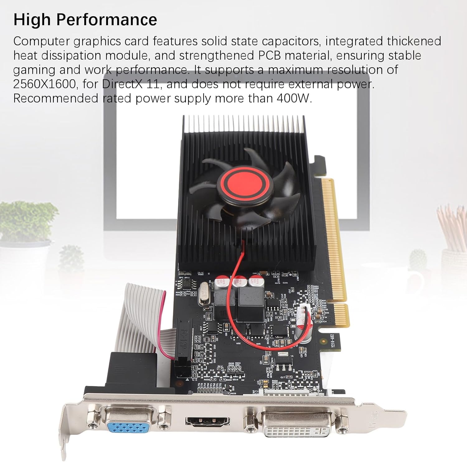 High Performance: Computer graphics card features solid state capacitors, integrated thickened heat dissipation module, and strengthened PCB material, ensuring stable gaming and work performance. It supports a maximum resolution of 2560X1600, for DirectX 11, and does not require external power. Recommended rated power supply more than 400W.