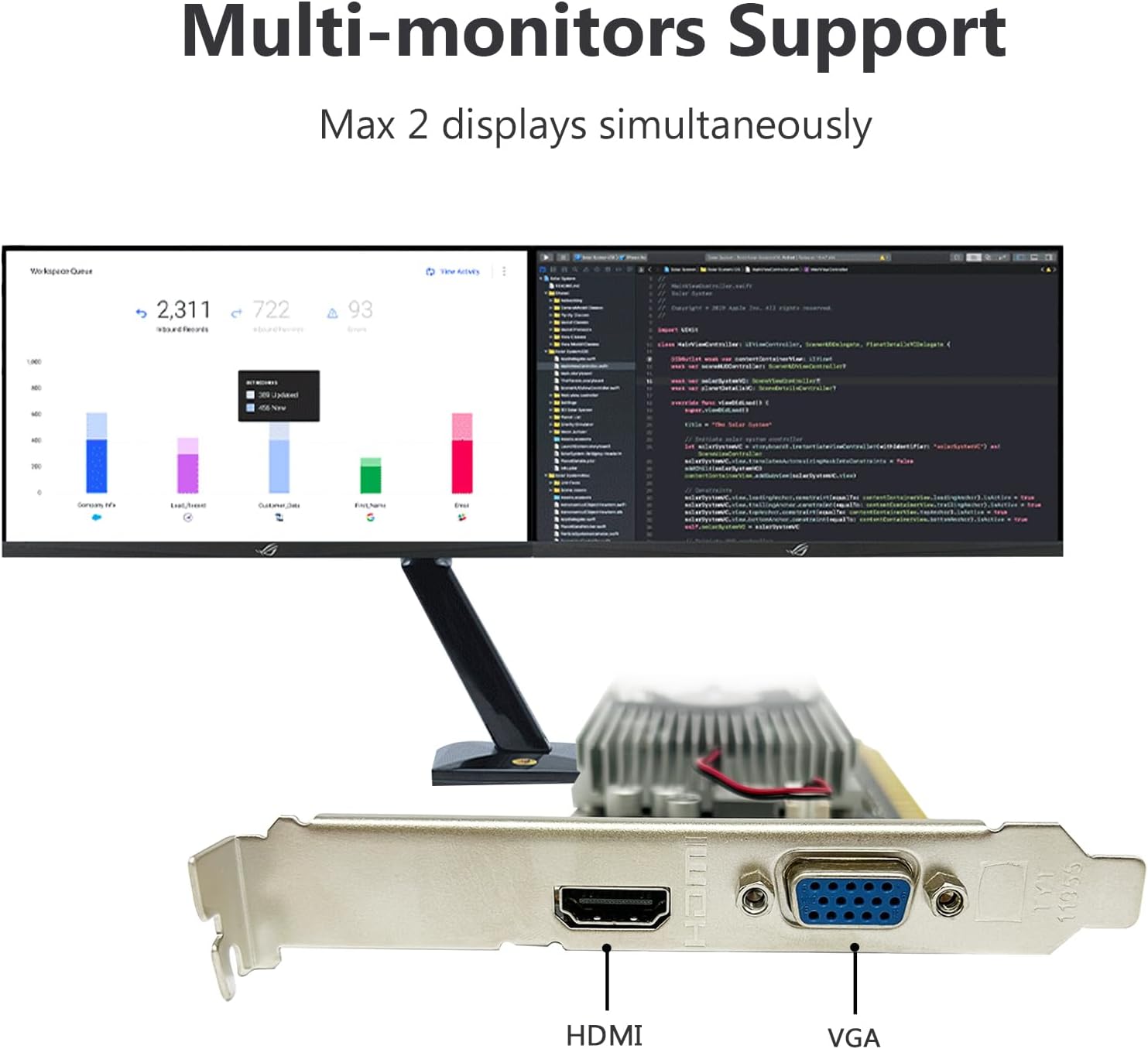 PCI Express 2.0 interface,offers compatibility with a range of systems. Also includes VGA and HDMI outputs for expanded connectivity,supports up to 2 monitors.Good for adding a simple low profile gpu to a small form factor pc.