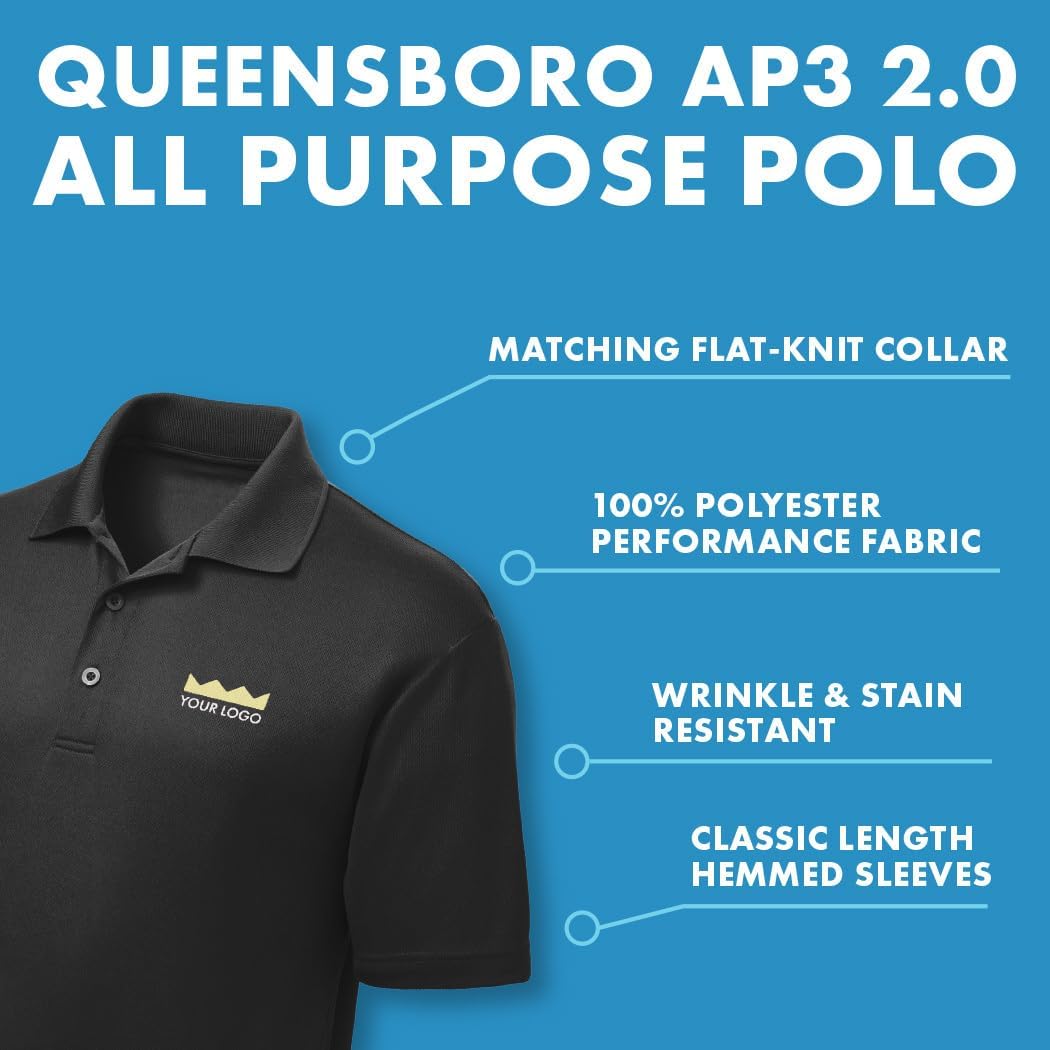 Upgrade your everyday look with the Queensboro Men’s AP3 2.0 All-Purpose Polo, the perfect blend of professionalism, comfort, and performance. Made from an advanced polyester blend, this polo is soft to the touch, breathable, and designed to wick away moisture—keeping you dry and comfortable both in and out of the office. When you’re managing a team, heading to a networking event, or meeting clients on the golf course, this polo ensures you look sharp and feel great. The wrinkle-resistant and colorfast fabric means less time ironing and more time focusing on what matters. Whether you’re outfitting your staff, gearing up for an event, or gifting clients, this polo makes your brand shine. Each shirt includes your custom embroidered logo, stitched with precision to stand out and last. Available in multiple colors and sizes | No minimums | Customization made easy