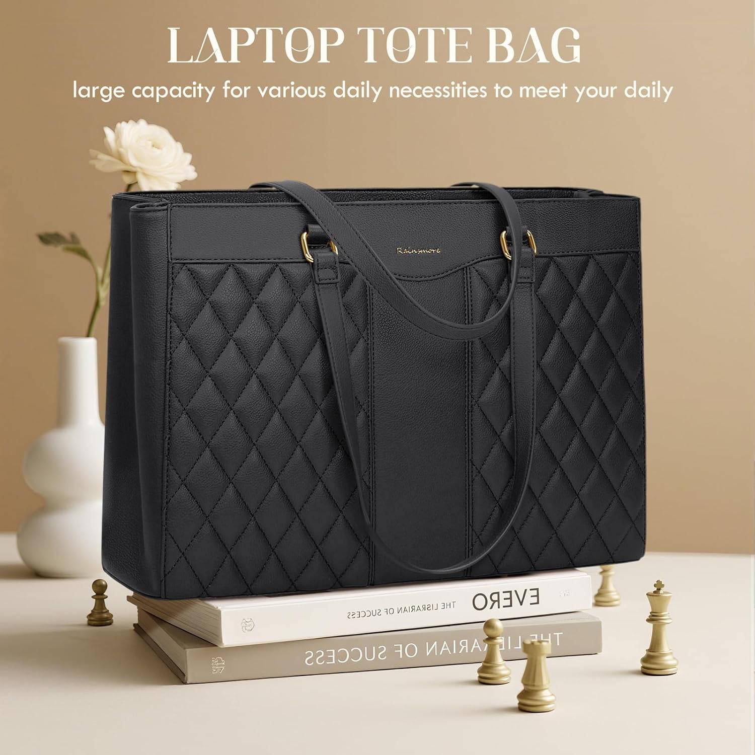STYLISH & COMFORTABLE: The modern fashion look of this tote, with its refined gold-tone RAINSMORE logo, exudes timeless sophisticated elegance. A generously sized 11-inch handles ensure effortless carrying, whether handheld or over your shoulder, while smooth-gliding zippers, reinforced stitching, and sturdy hardware enhance the durability of this laptop purse. Designed for versatile use, it transitions perfectly from professional commutes to casual outings