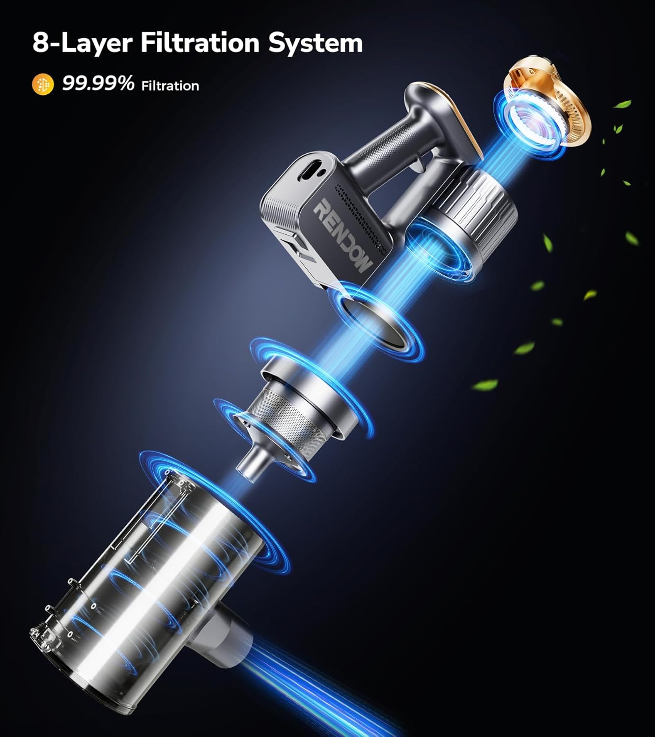 【65-Mins Runtime, Whole-Home Cleaning Freedom】This vacuum cleaners for home engineered with 8x2600mAh lithium-ion cells battery delivers 65 minutes of continuous deep-cleaning runtime. Complete 2,500 sqft homes without interruptions,clean multi-story residences in single charge.Includes rapid-charging wall dock (0-100% in 4hrs) with storage for clutter-free organization
