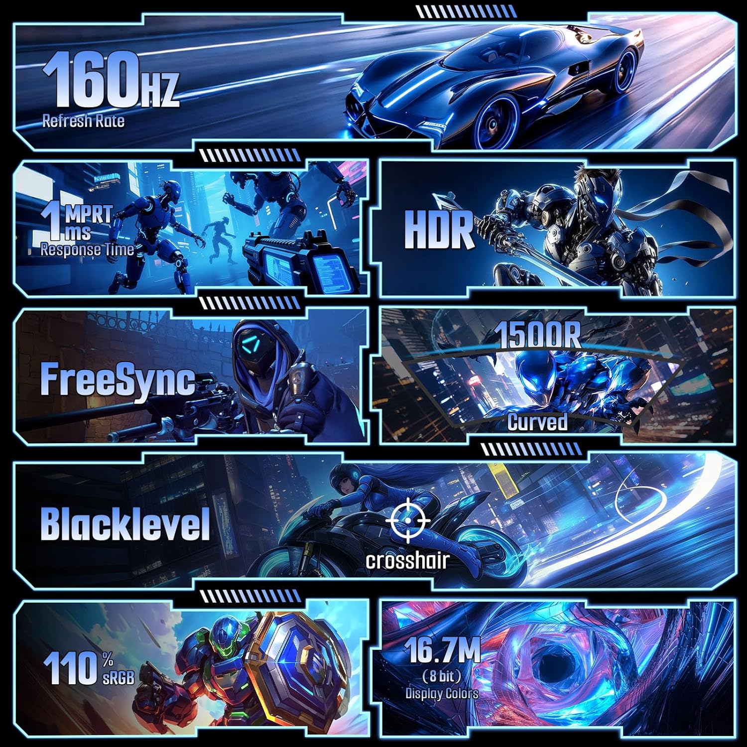 Smooth Gaming: Up to 160Hz Refresh Rate, MPRT 1ms Response Time, Freesync Compatibility. Black level Adjustment, Crosshair, Game Timer, Various Game Modes( FPS/RTS/MOVIE/STANDARD)