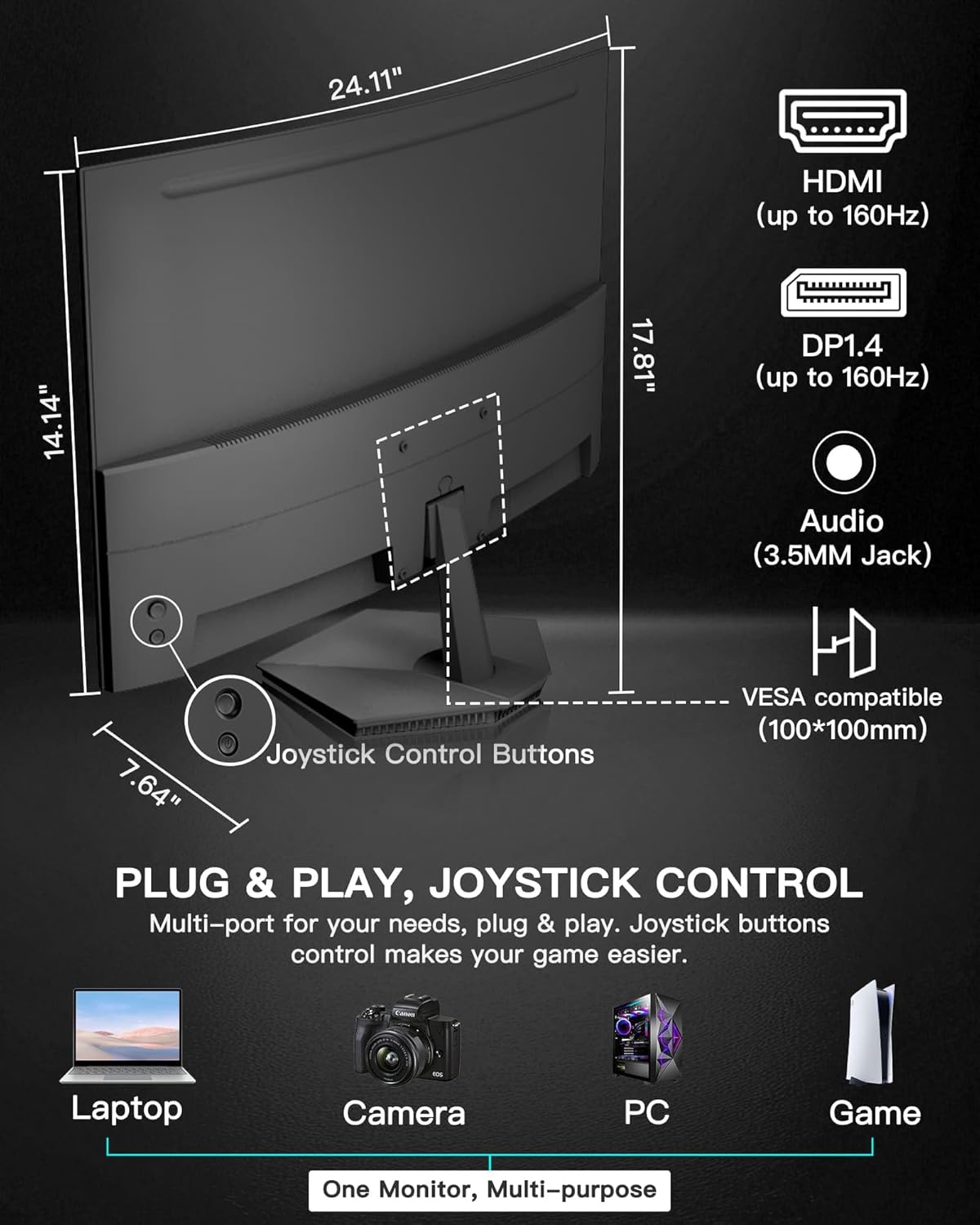 Jacks: HDMI 2.0(160Hz max), DP 1.4(160Hz max), Audio Jack(No Speakers) | VESA 100x100mm | Tilt (-5°~15°±2°).