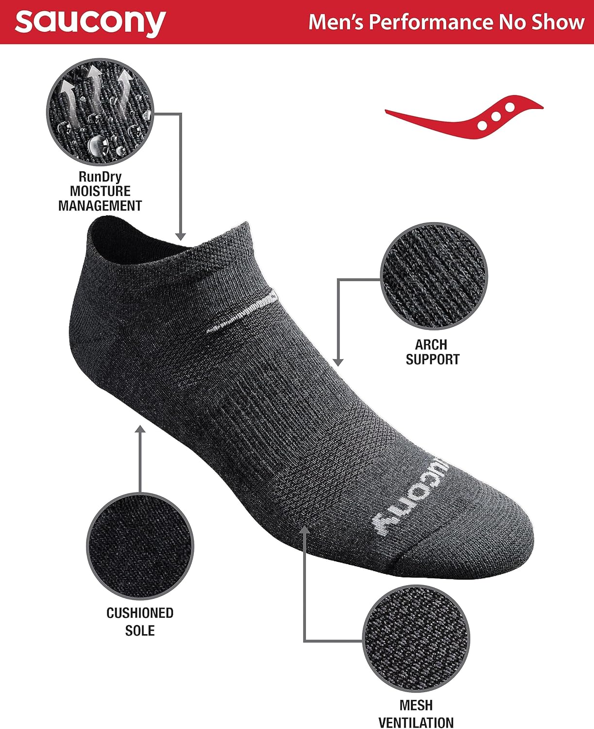 Saucony men’s performance no show socks is a perfect combination of comfort and support. Great for the toughest training sessions. Its arch support, air mesh venting, and moisture management features will ensure lasting comfort