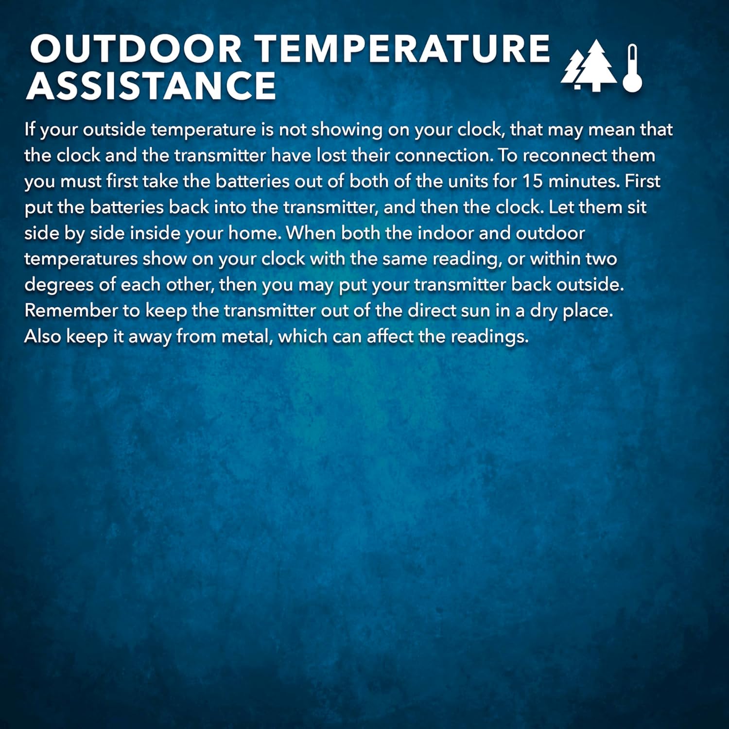Atomic Accuracy: The Atomic clock has a built-in receiver that automatically synchronizes itself with the WWVB radio broadcast by the US Government’s National Institute (NIST) in Fort Collins, Colorado. The Atomic Clock will always be accurate to within one second as it receives daily WWVB updates.Wireless Outdoor Sensor: The Wireless outdoor sensor (included) transmits the outdoor temperature to the Atomic Wall Clock. The sensor can be placed anywhere within 100ft of the receiving unit. The wireless technology means no wire installation is necessary.Jumbo 3.3” Tall LCD Time Display – Easy to Read, Easy to Use, Easy to Set upDisplays indoor and outdoor temperature – Displays calendar and day of weekBattery powered: Main unit 3 x AA batteries Sensor 2 x AA batteries (not included)