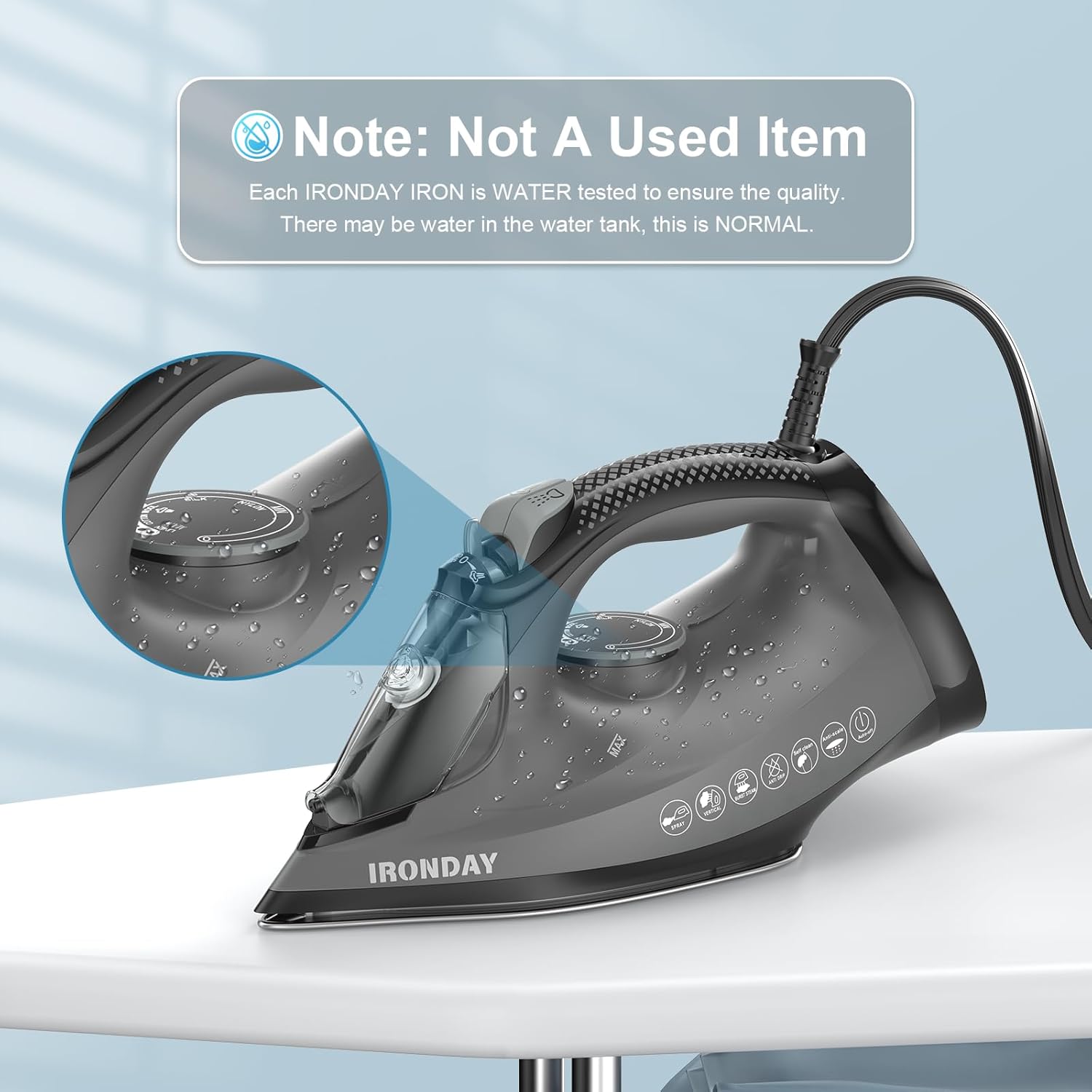 【Not An Used Item】We test each of our steam iron by water to ensure the quality and safety of the product. Please do not worry if you find water residue inside.