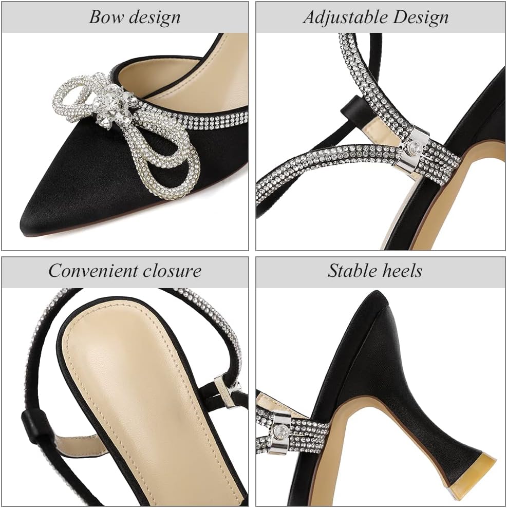 Susanny Women’s Closed Toe Rhinstone Wedding Low Heel Slingback Clear Kitten Heels,Adjustable Strap Pointed Toe Bow Pumps High Heeled Prom Dress Shoes