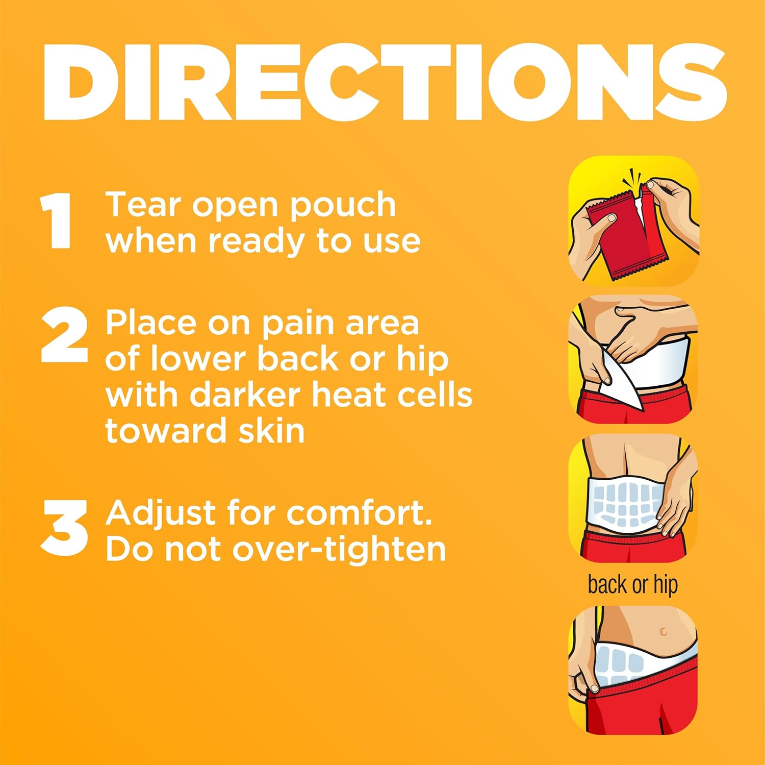 Back Pain HeatWraps: These air activated HeatWraps provide up to 16 hours of pain relief. Set Includes 5 Lower Back wraps (L/XL Size)Advanced Design: Single use wraps that are thin enough to be worn discreetly. Heat cell placement that stays close to your skin; Designed to adapt to your movements and easy readjustmentEffective Pain Relief: Wraps provide heat where you need it; Drug free, discreet and portable, so you can use them anywhere; Targets: Body Aches, Pains, & ArthritisTherapeutic Heat: Our patented technology produces real heat to help your body rebuild damaged tissue & accelerate healing.Real Heat, Real Healing: Heat therapy helps to ease muscle pain, reduce soreness, and loosen tight muscles by blocking pain signals & improving circulation & flexibility