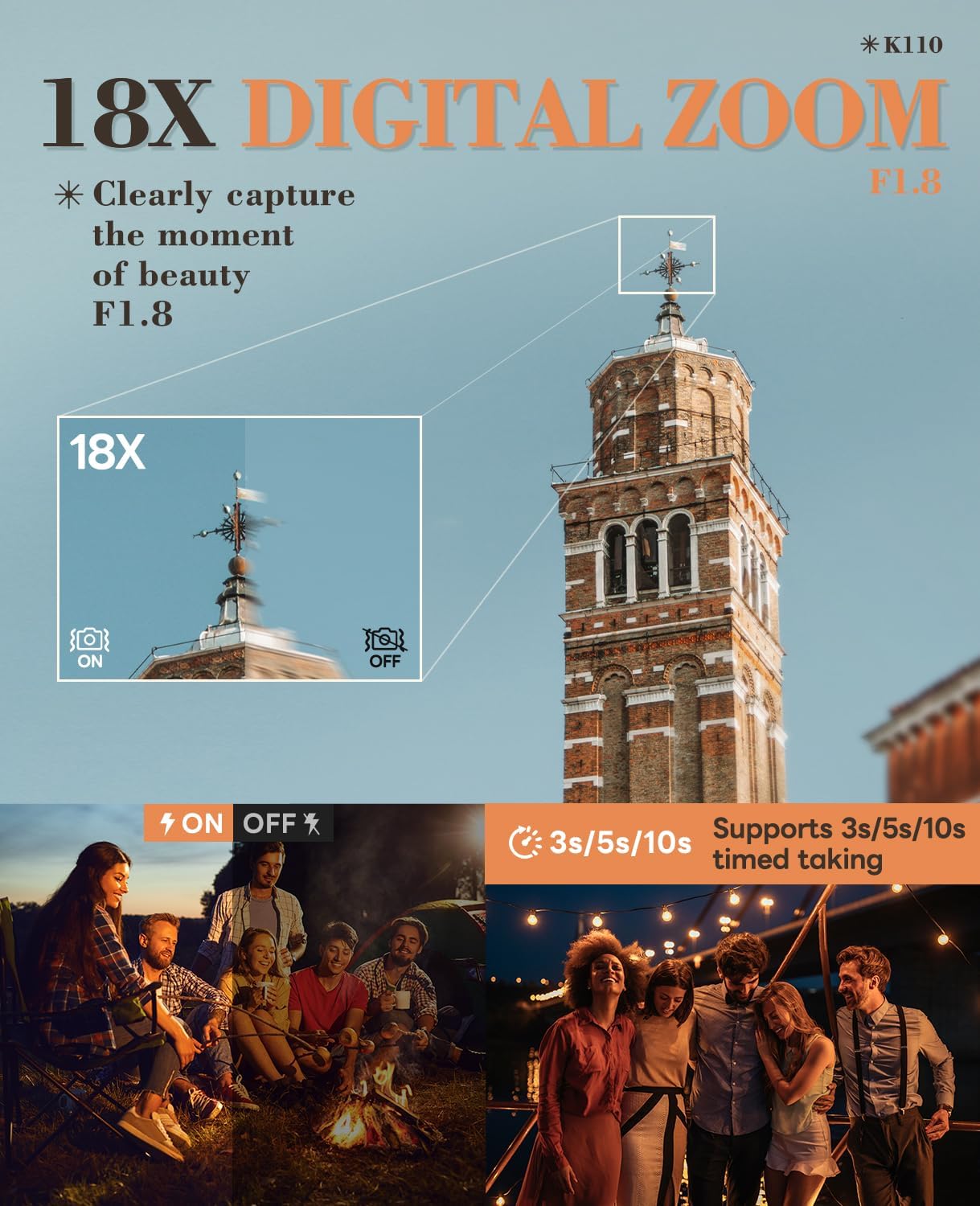 【18X Digital Zoom & Multi-Scene Modes】The 18X digital zoom allows you to effortlessly capture distant scenes, making it an ideal choice for landscape photography. With an intuitive dial design, you can easily switch between slow-motion, macro, filter, and other preset modes, perfect for both beginners and advanced photographers. Combined with an F1.8 large aperture and autofocus function, it ensures beautiful memories are captured effortlessly, whether for travel photography or daily vlogging.