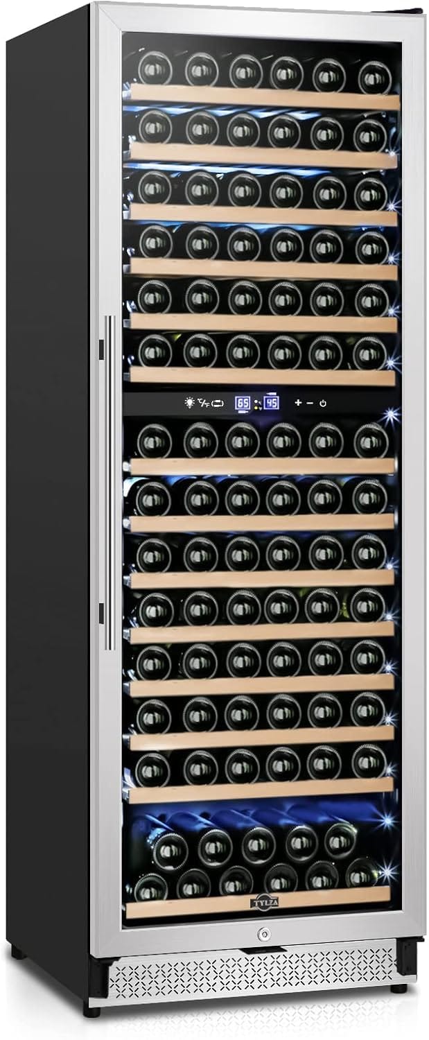 180 Bottles Large Capacity:The 24” dual zone wine fridge features 14 beech wooden shelves that can store up to 180 bottles of standard Bordeaux (750 ml) wine and the bottom shelf has large capacity that you can load large bottles;Durable beech wooden shelves No shake No damage bottle when sliding in or out;