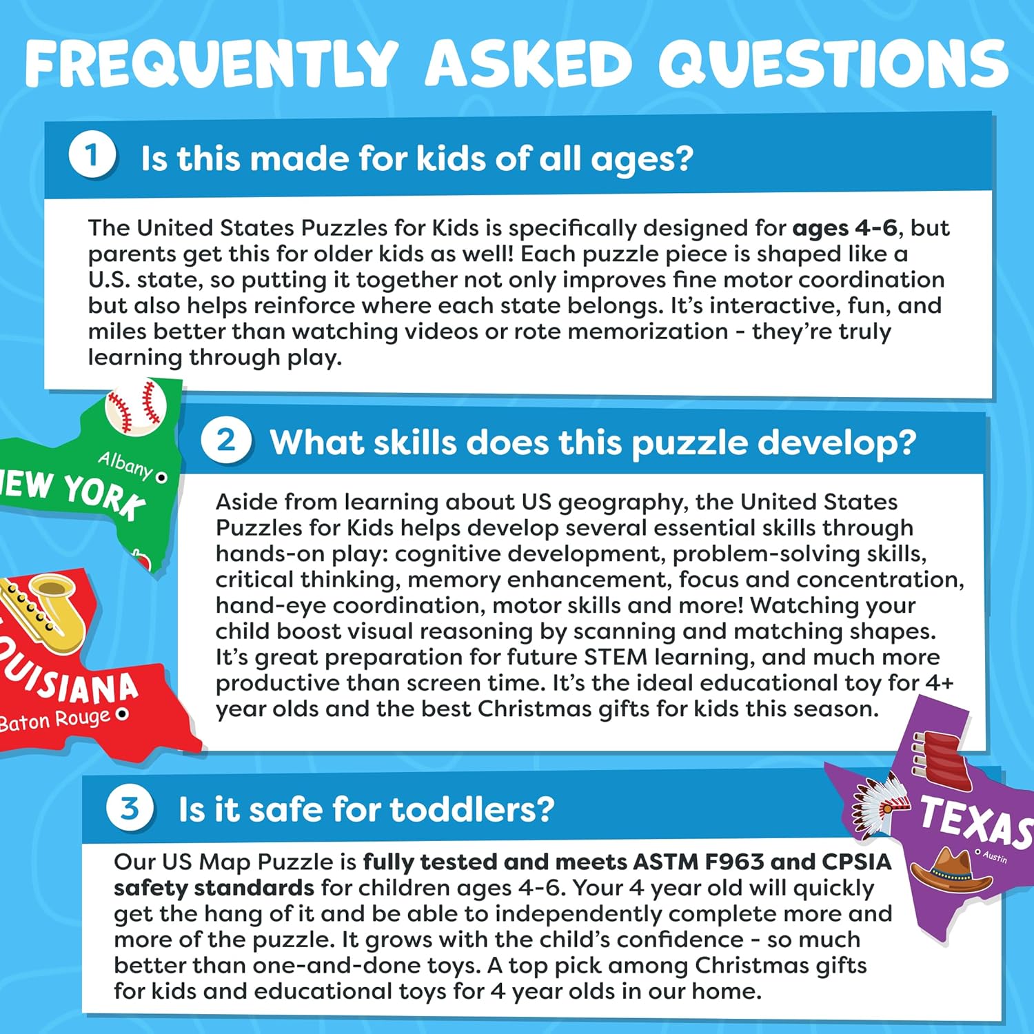 Durable Design Stands Up To Repeated Play. Crafted with sturdy 2mm chipboard, this premium United States puzzle has a glossy finish that showcases colorful artwork while meeting ASTM F963 and CPSIA safety standards. Whether used as travel-friendly learning toys or classroom educational tools, kids love this reusable puzzle. Perfect educational toy for developing minds. Add these Christmas gifts for kids to your Cart now.