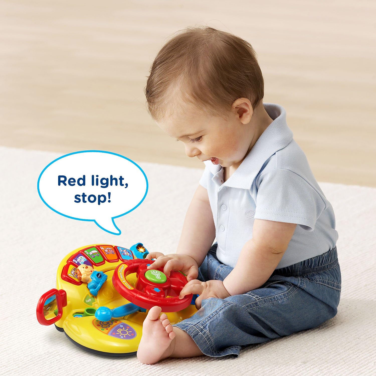 Little hands eager to explore can turn the steering wheel and press colorful buttons to discover animals, vehicles and sounds with over 60 songs and phrases